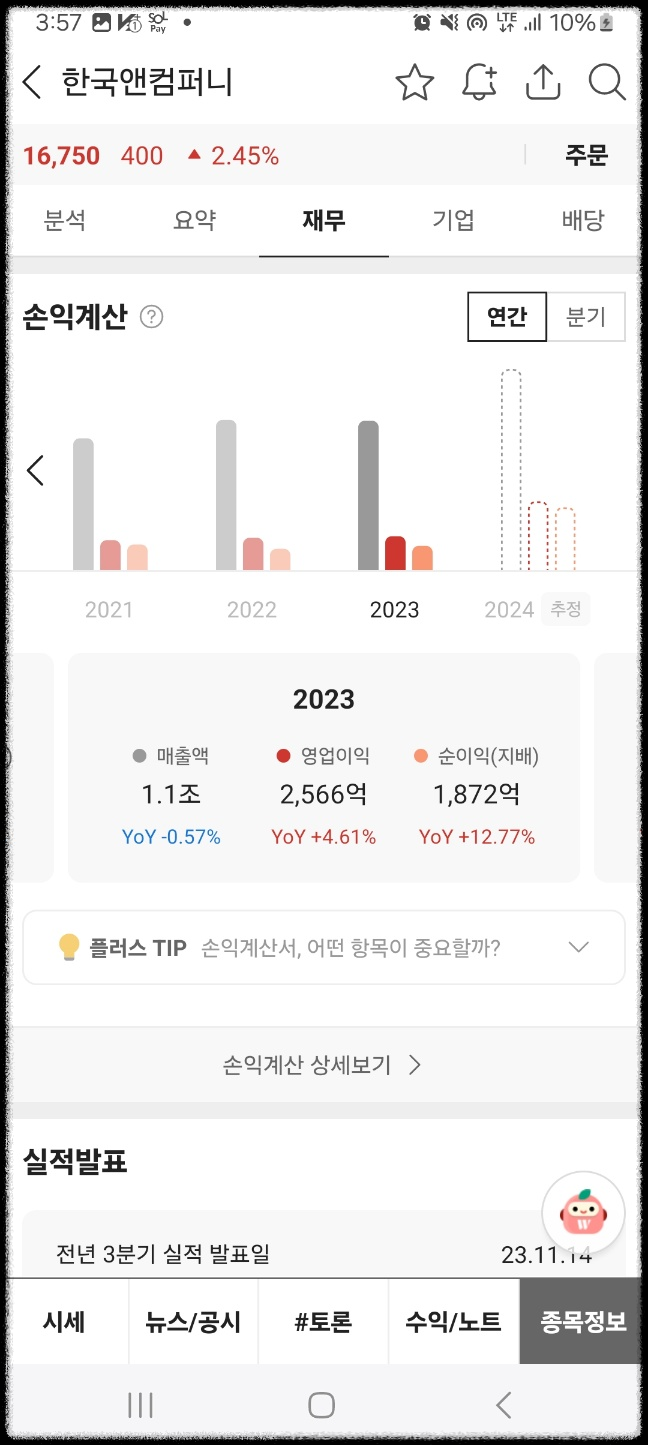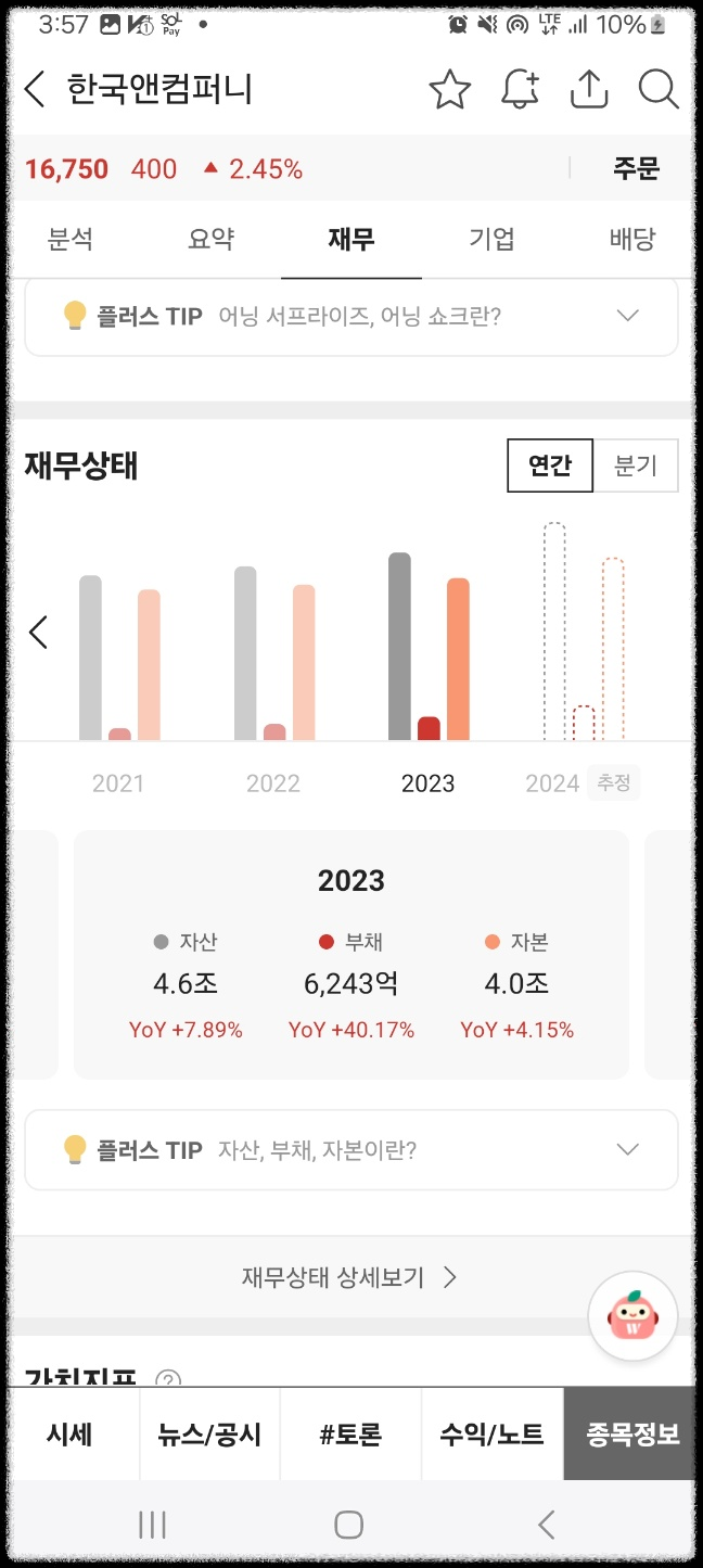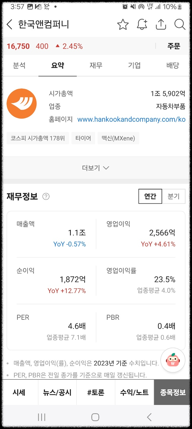 밸류업 총력이라는 기사가나왔다. 기사에 의해 큰 변동은 없었다. 하루 거래량도 2.9만주이다. 거래량이 매우매우 적다. 시가총액은 1조원대 이며 매출이 1조원이다. 자본은 4조원이다. 타이어사업이 주 사업이다. 단기적인 상승을 예상했지만 회사 구조도 꽤 괜찮아보였다. 잘 만들어진 제조업 업체 느낌이다.