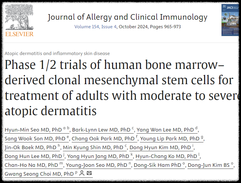 주가 변동과 관련된 해당 논문이다. 사람의 골수에서 유래된 clonal mesenchymal stem cell을 사용해서 아토피를 치료하는 것이다. 논문은 24년도 10월에 나왔다. 교신저자는 인하대 피부과 교수님인 최광성님이다. 1저자는 한양대 서현민 피부과 교수님이다.