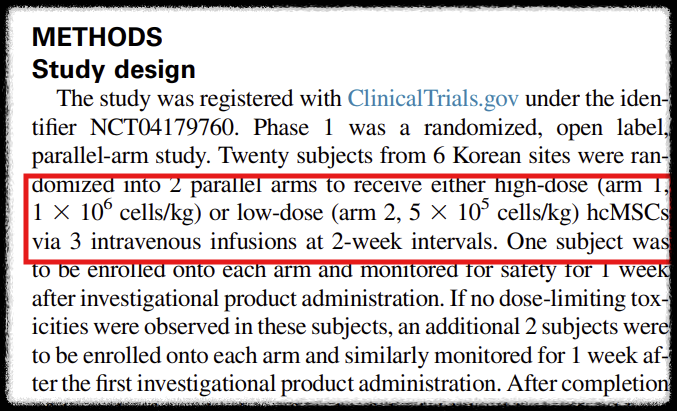 2주간의 간격을 두고 총 3회 정맥으로 이 세포를 투여했다. 농도는 2개로 진행했다.