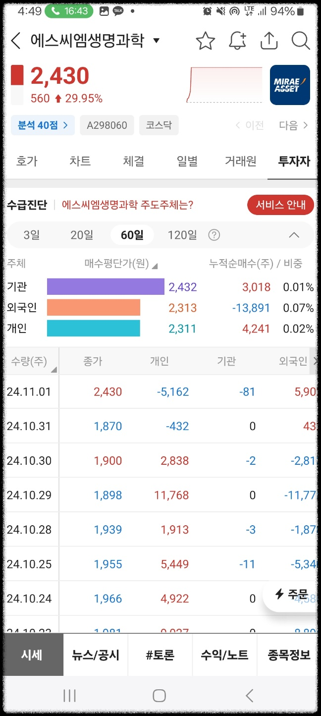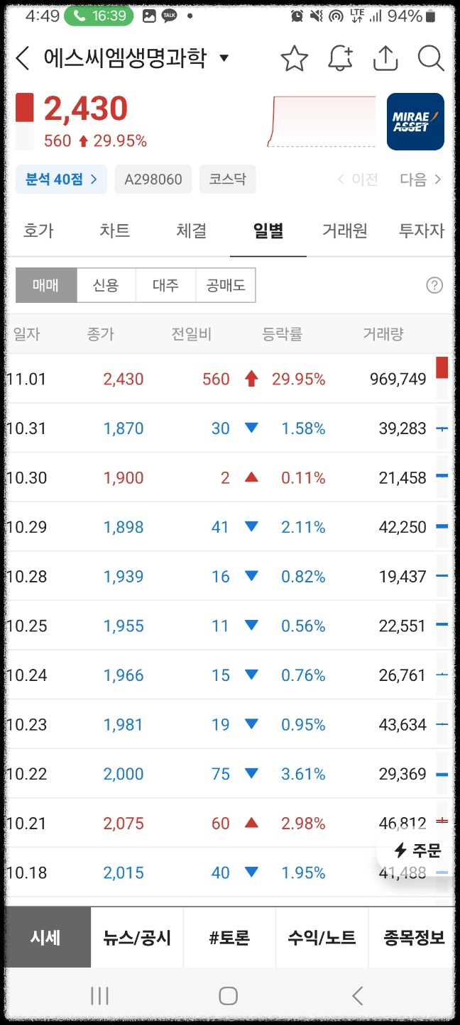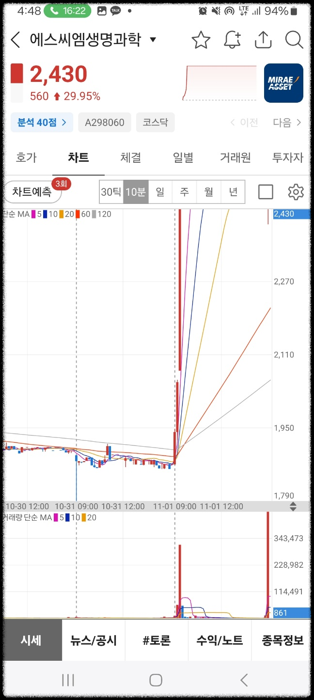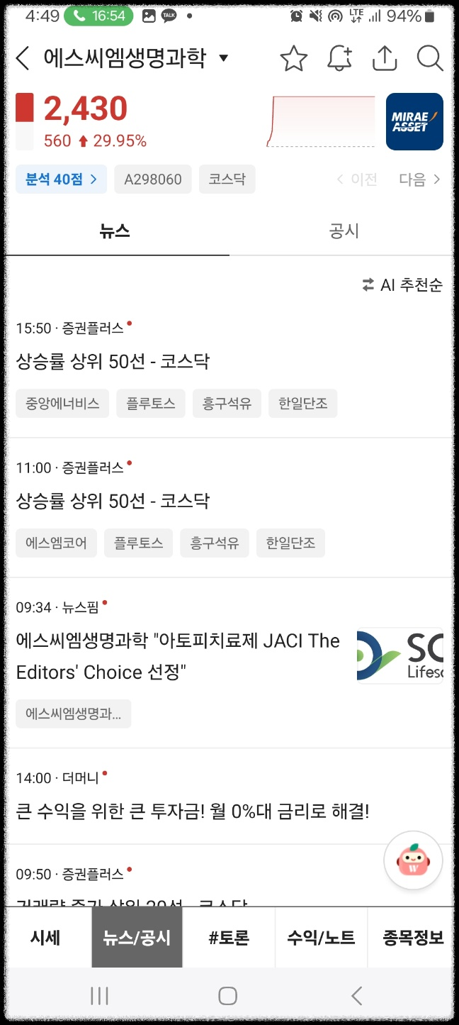 에스씨엠생명화학. 논문이 editor choice가 되었다는 뉴스 이후로 바로 급등. 상한가로 마무리했다.