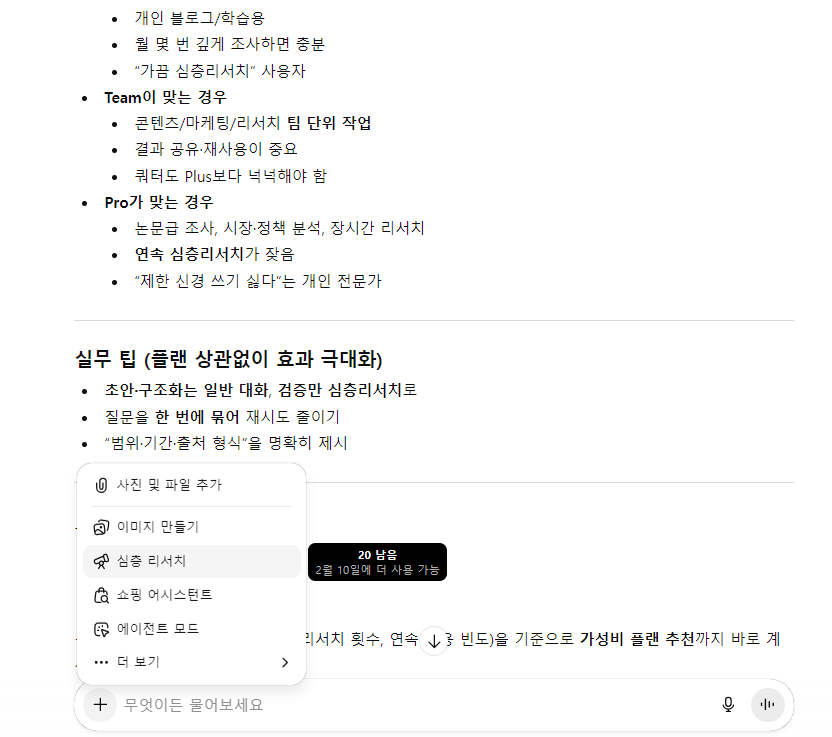 특히 심층리서치 제한은 대표적인 “쿼터형 기능”이라 무제한으로 보기 어렵습니다.