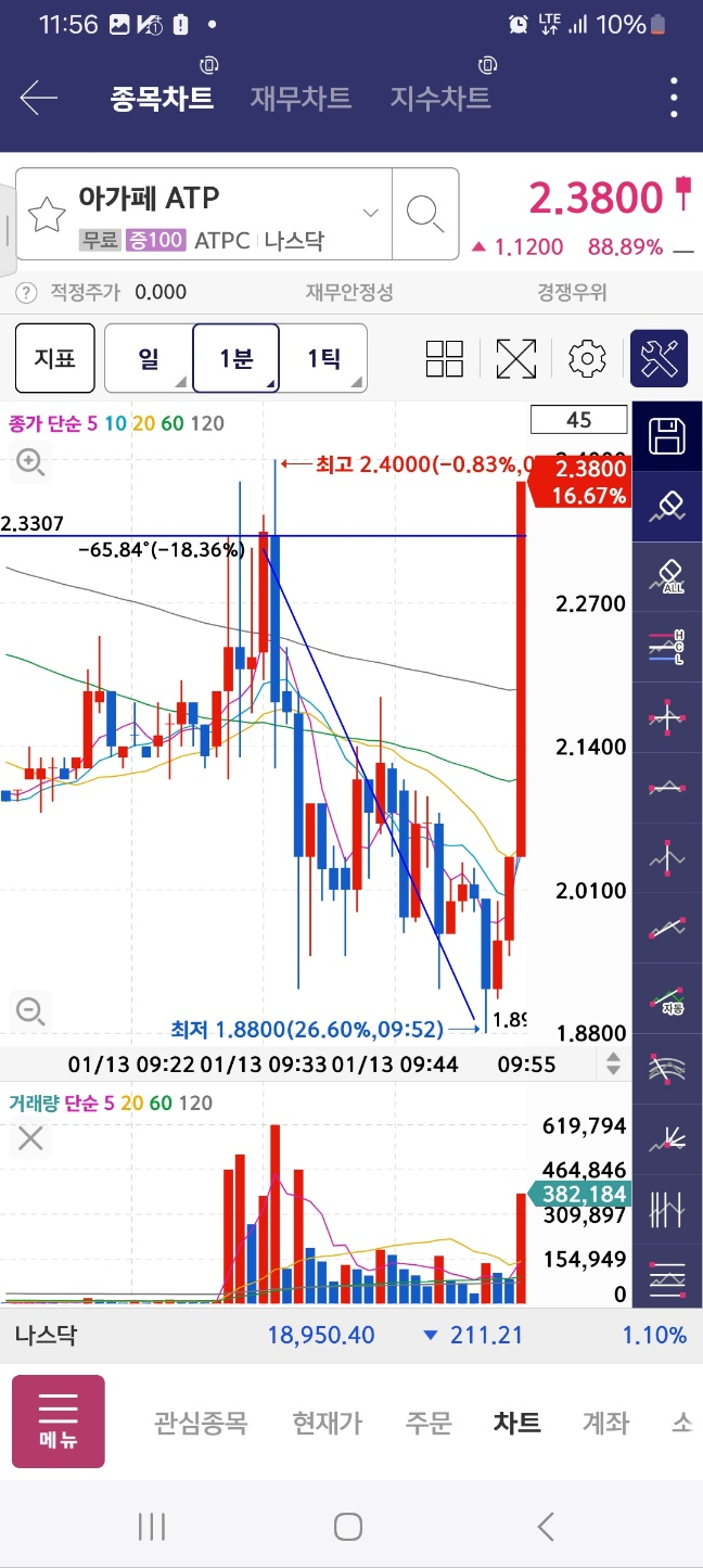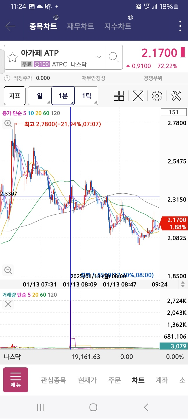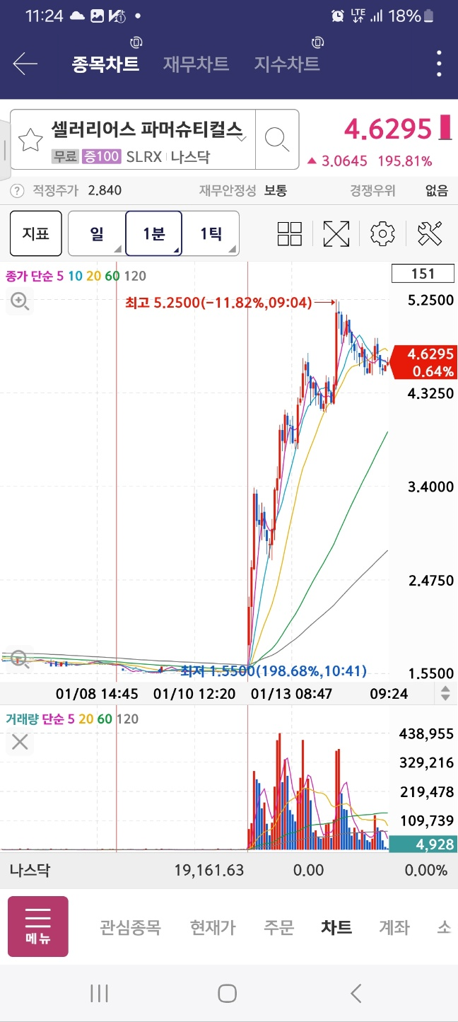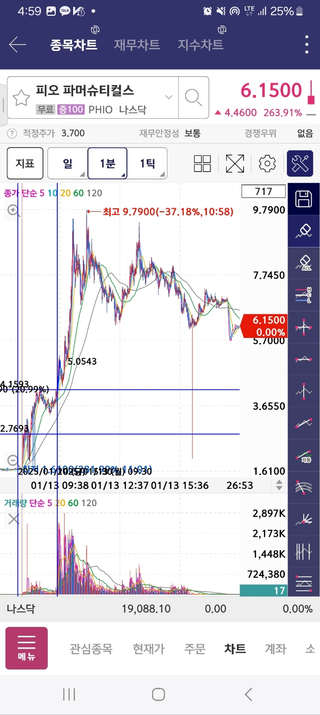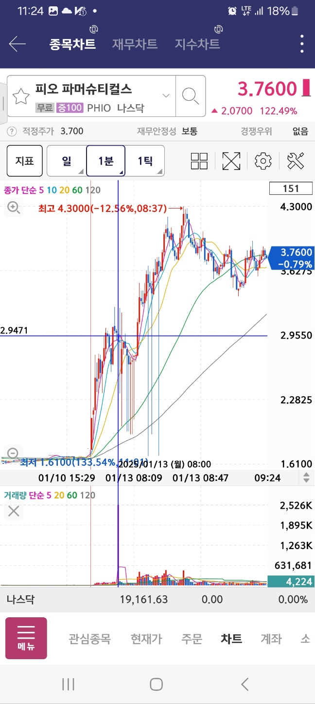 피오의 경우 개장 전에 상승을 이어서 계속해서 상승한다. 30분 내에 20%정도의 상승을 만들어낸다. 수급 들어왔다.