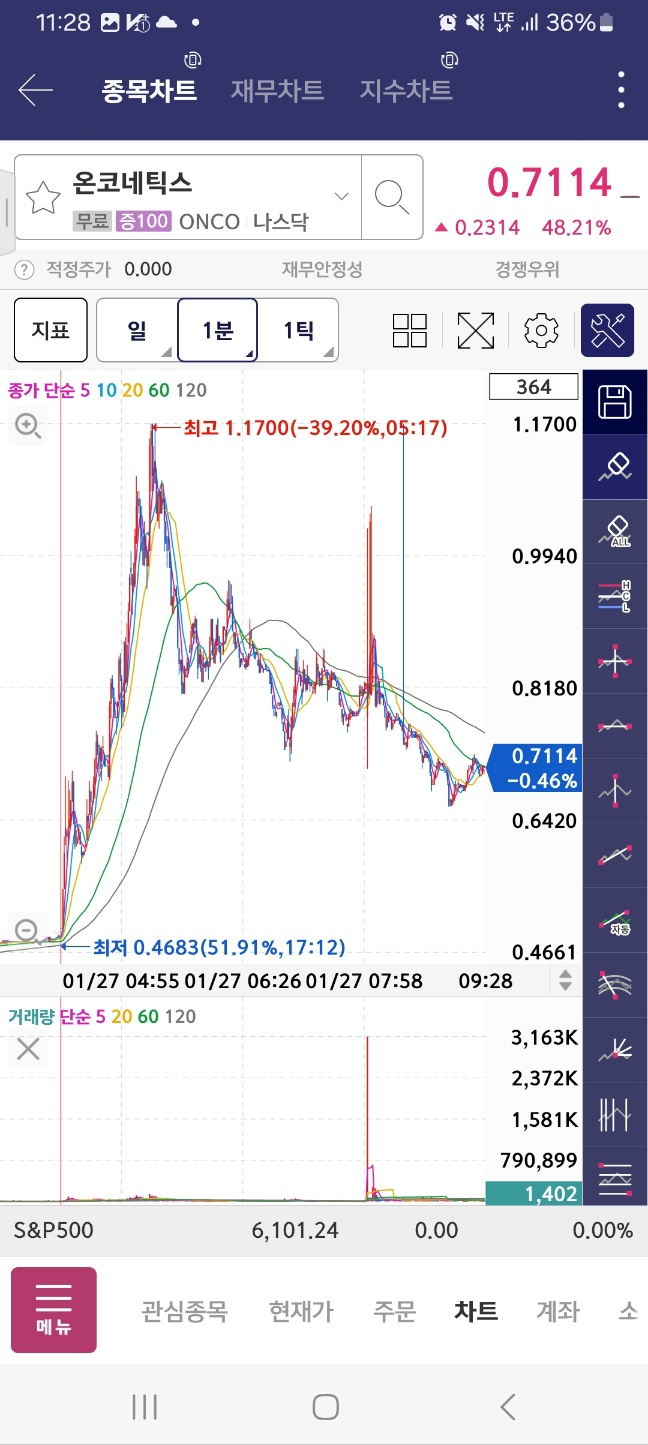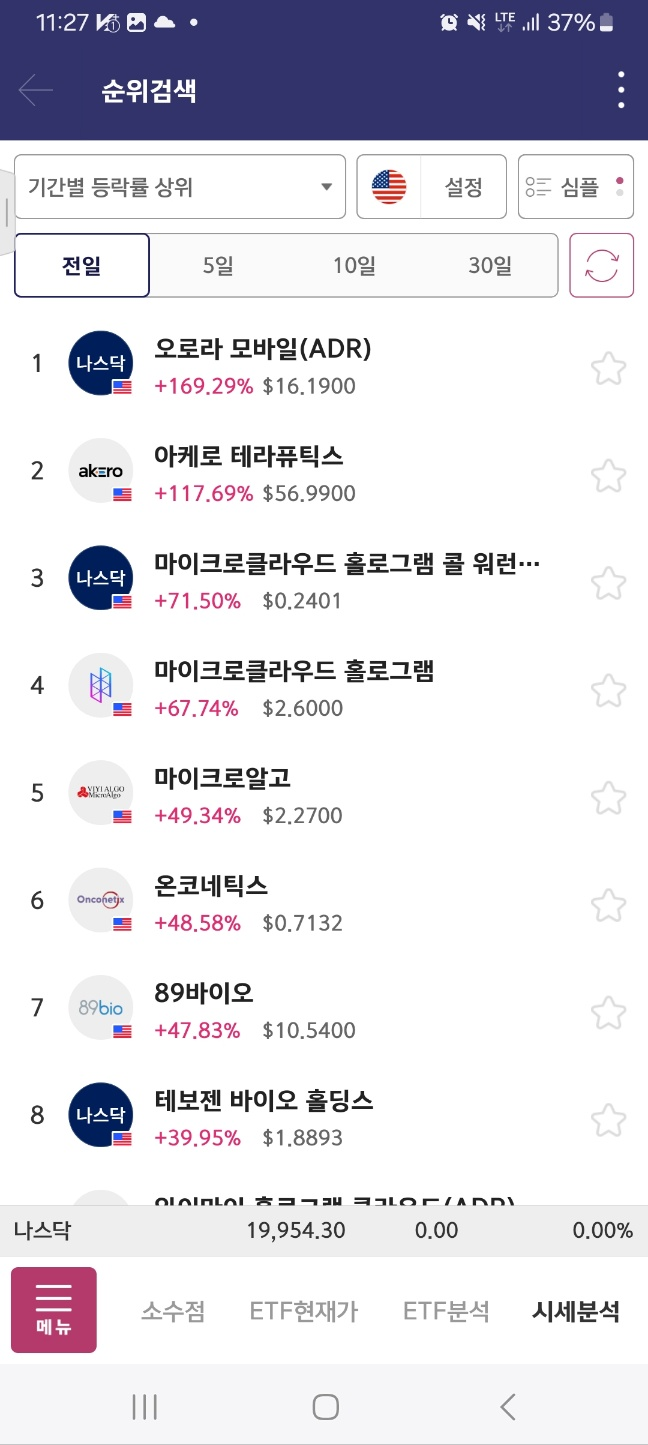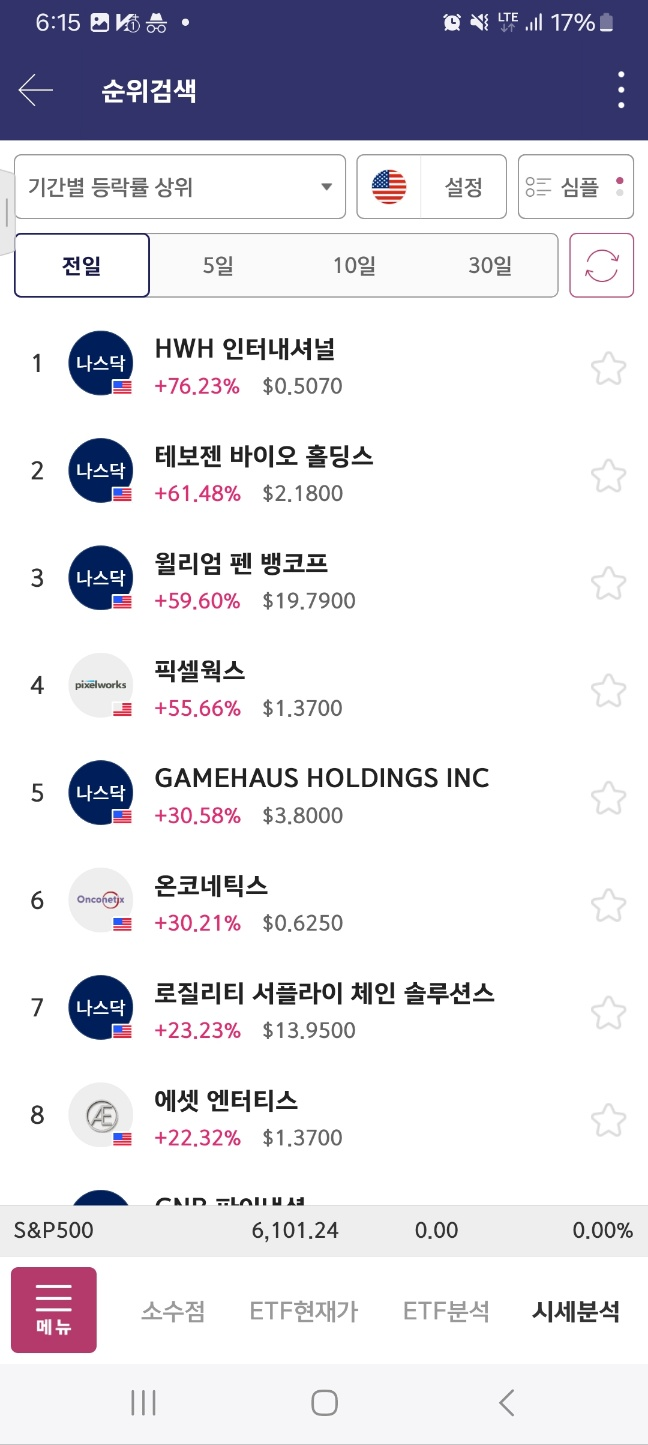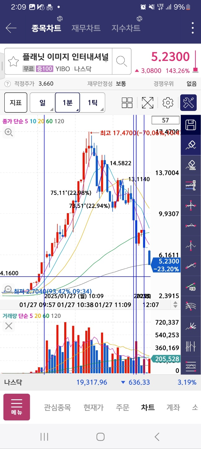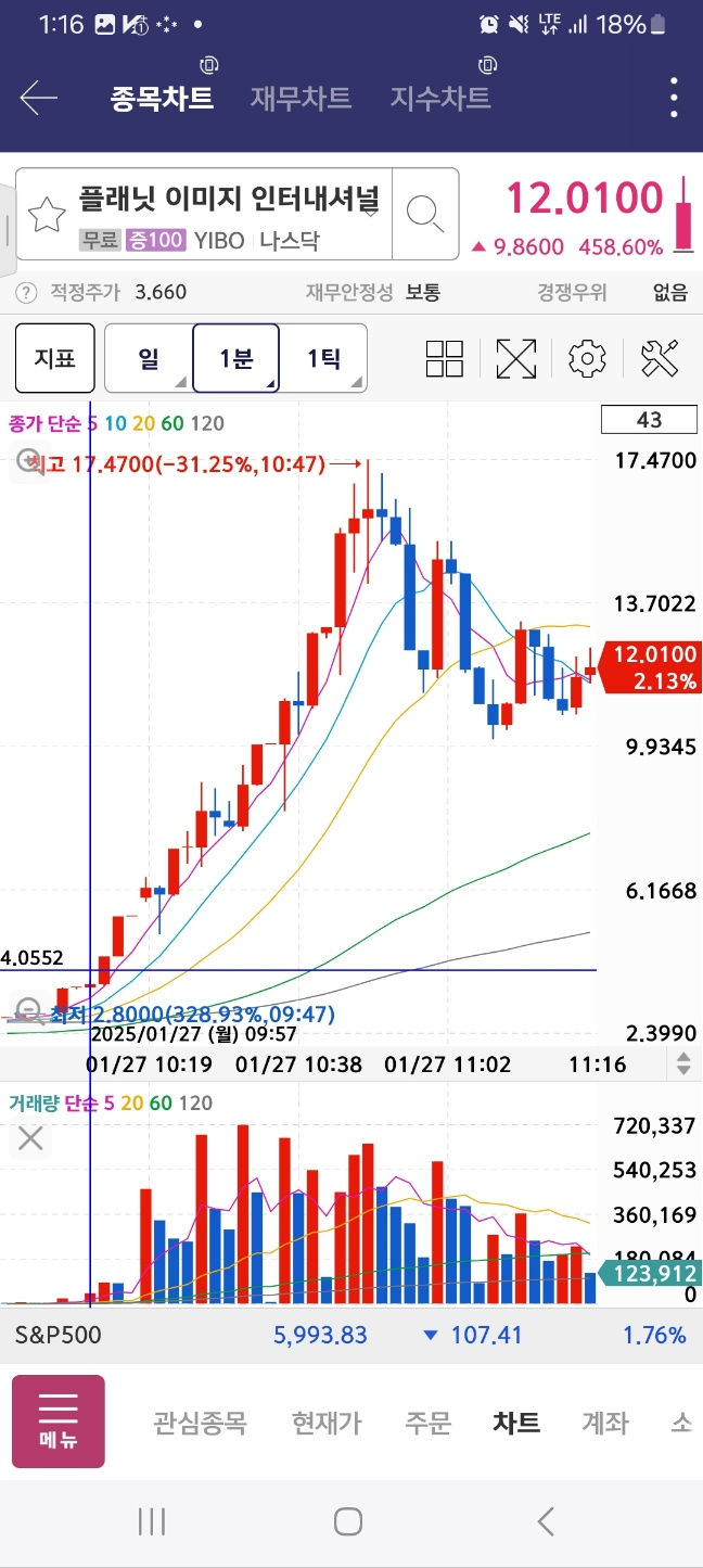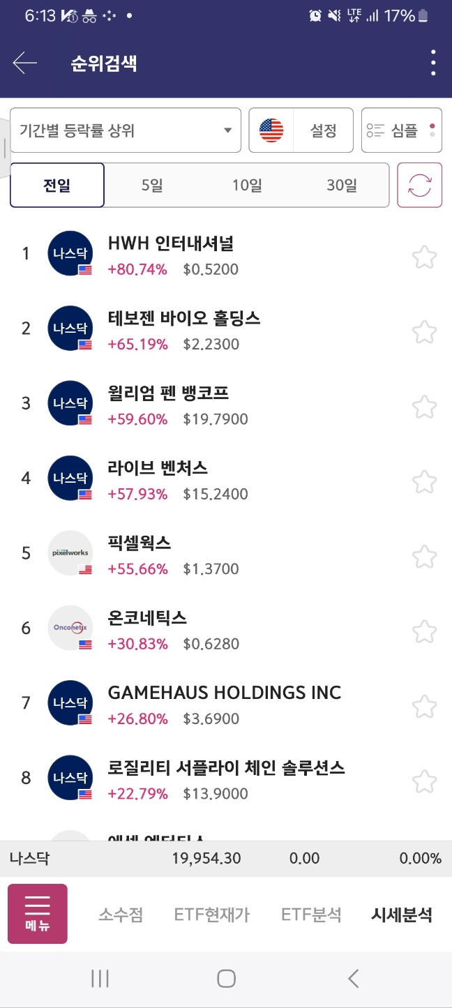 개장 후 올라온 종목. 거래가 중간중간 멈추면서 상승함. 17달러까지 상승후 급하락.