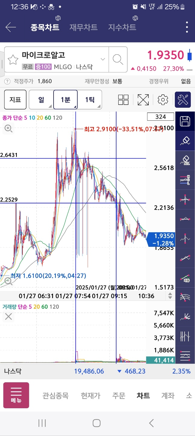 장 초반 수급이 들어왔지만 >> 하락