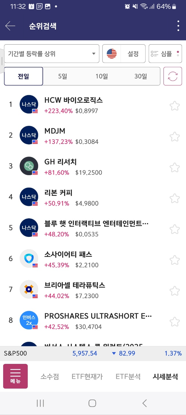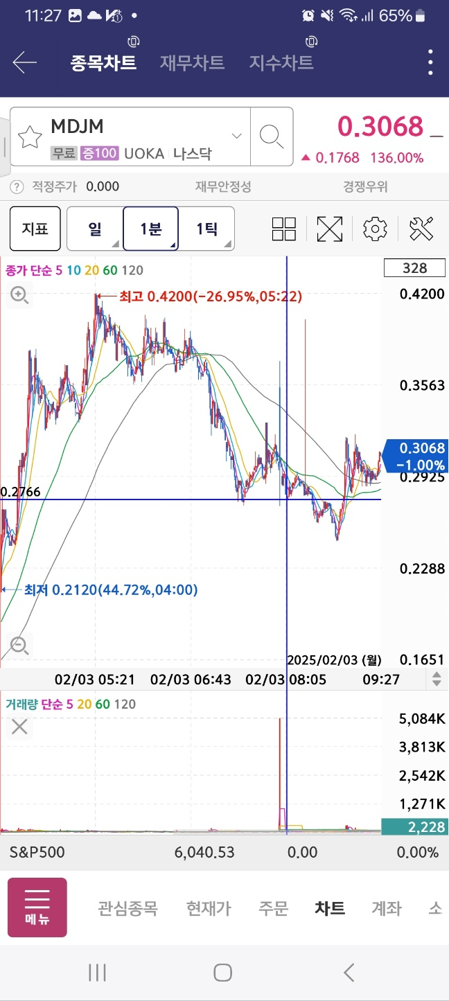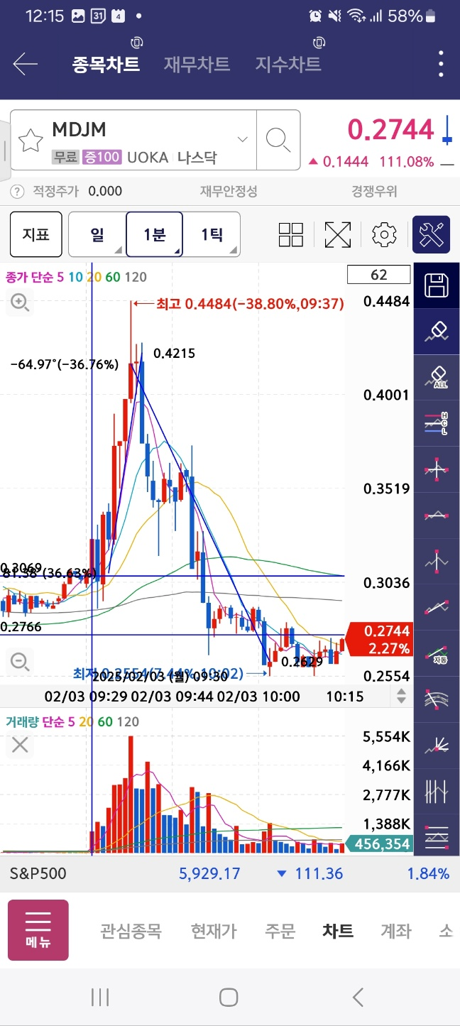 개장 초반 5분간 지속 상승. 약 30프로 상승함. 이후 하락세로 36프로 하락함.
