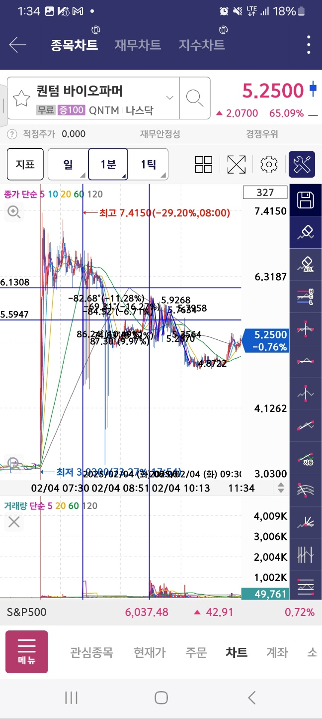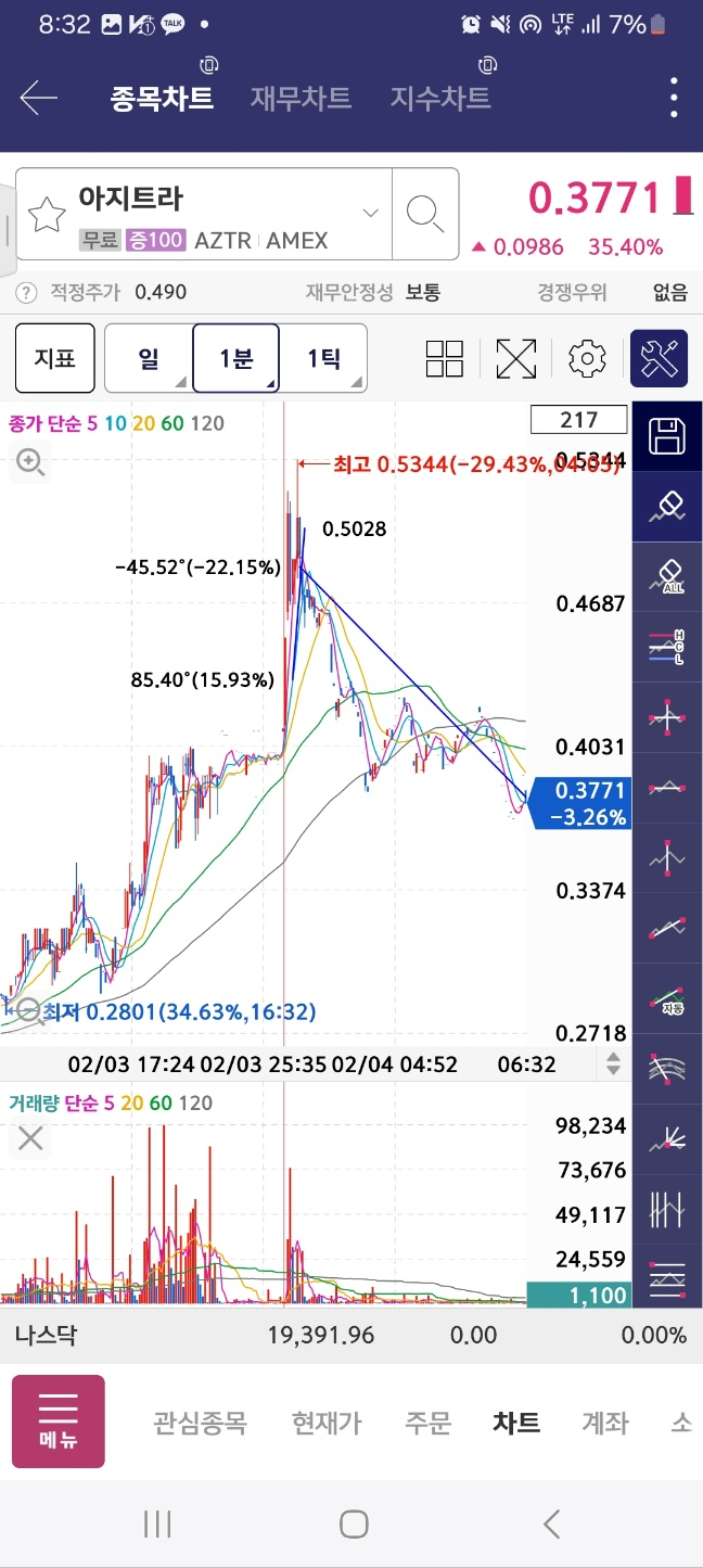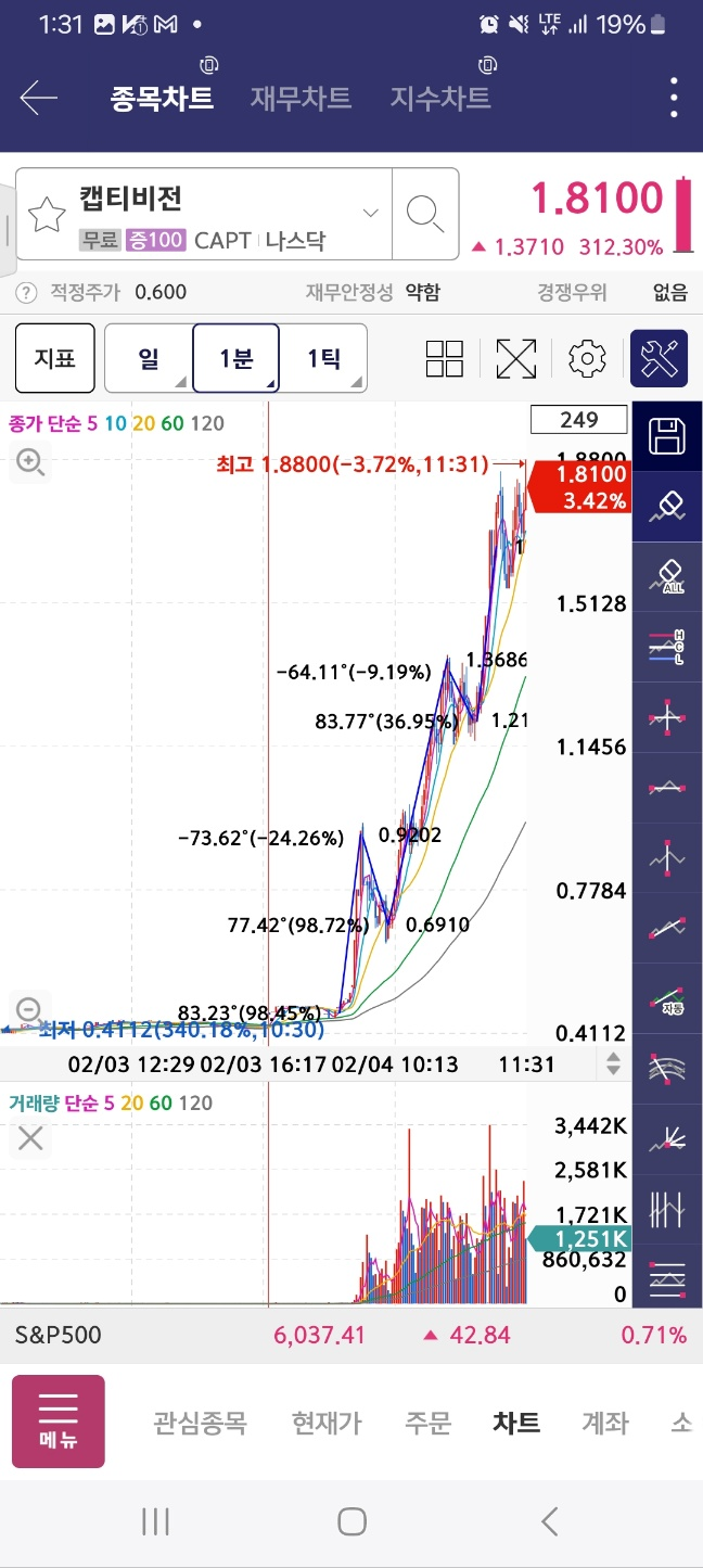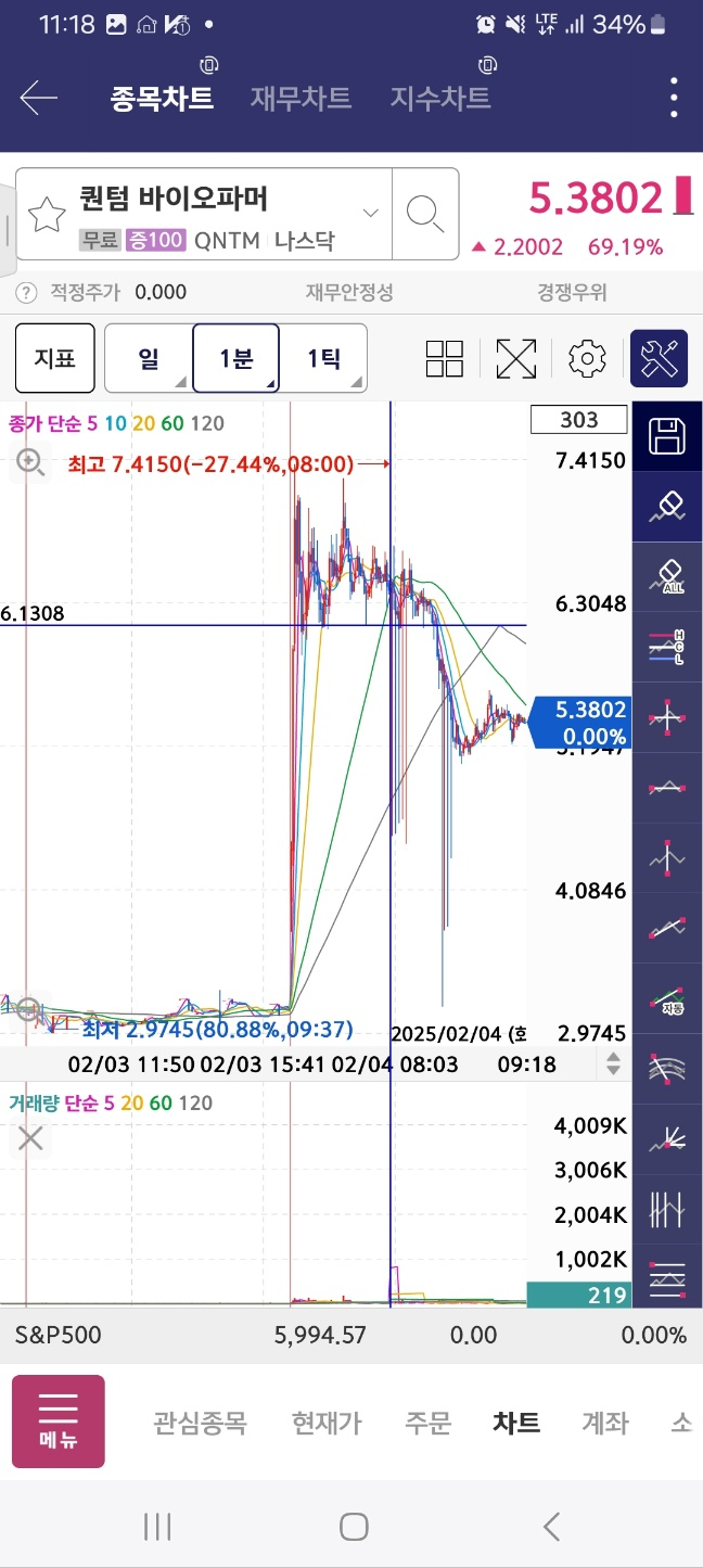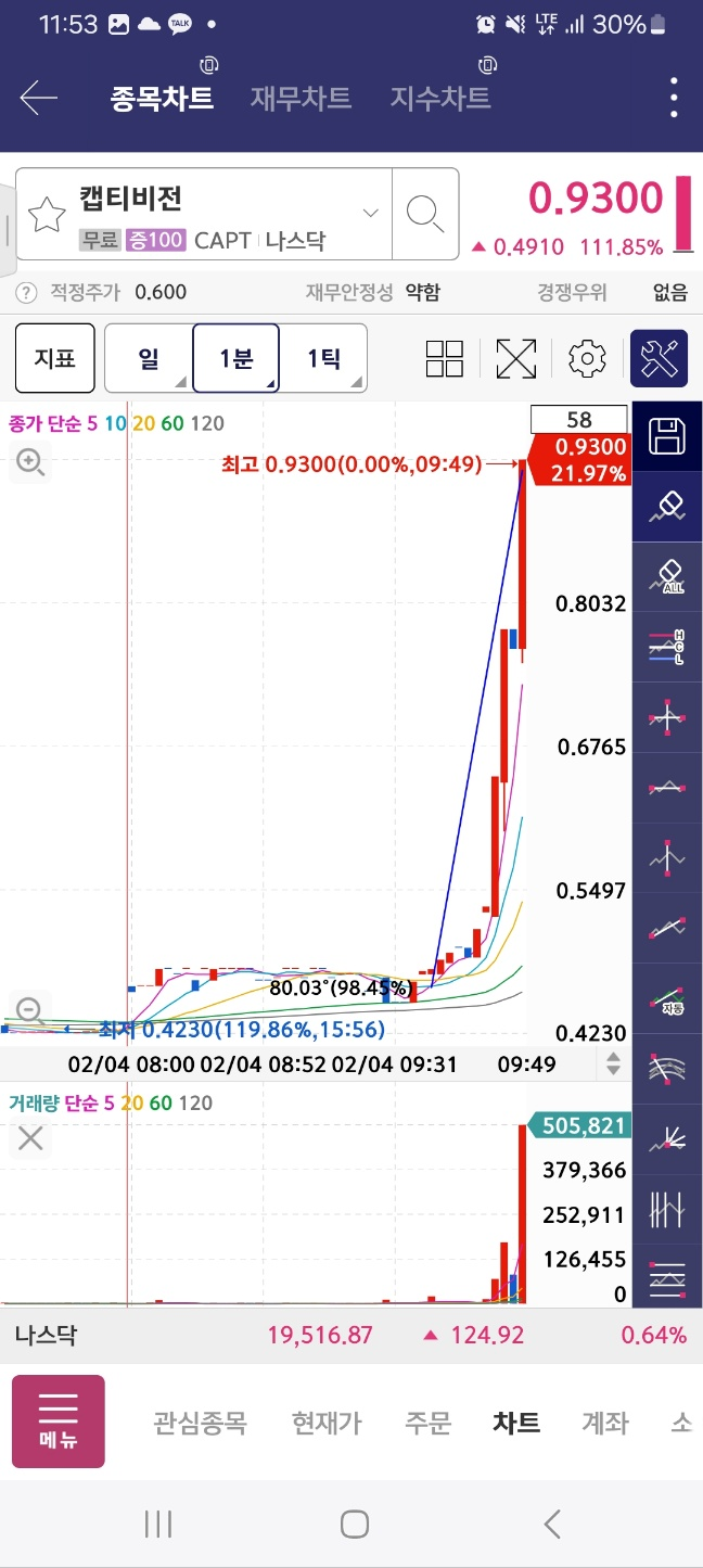 개장 후 거래 들어온 종목. 개장 후 300프로 가까이 상승. 초반 98프로 상승 후 25프로 하락. 다시 98프로 상승 후 10프로 하락.