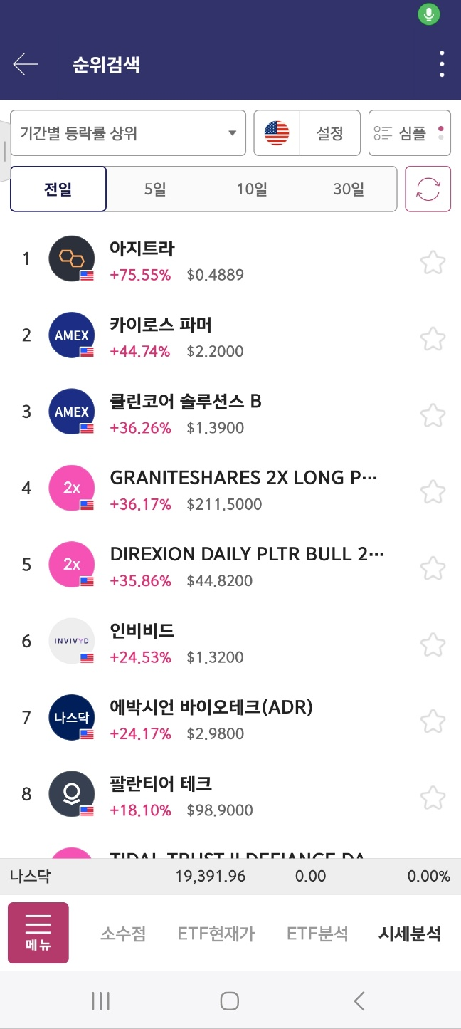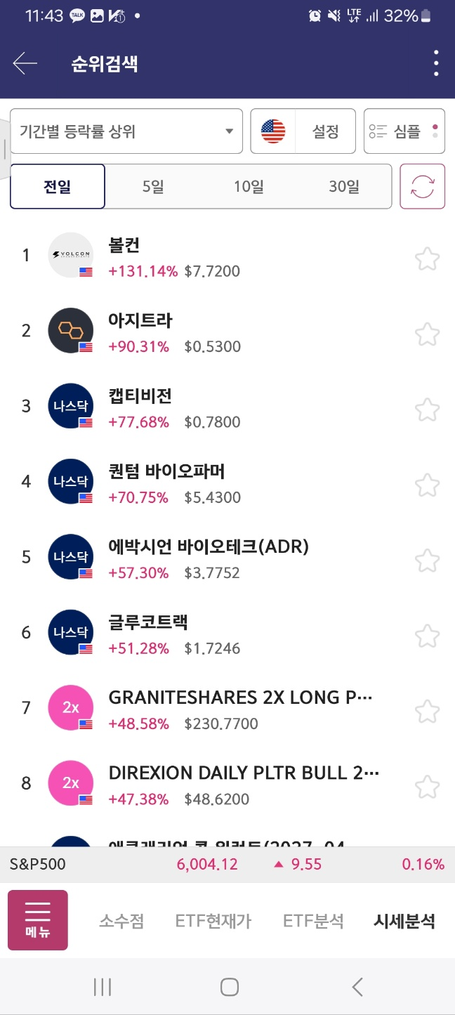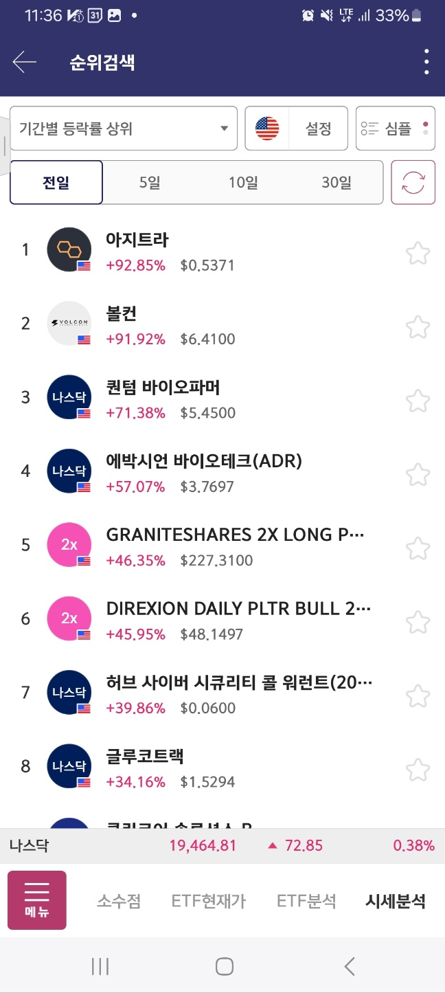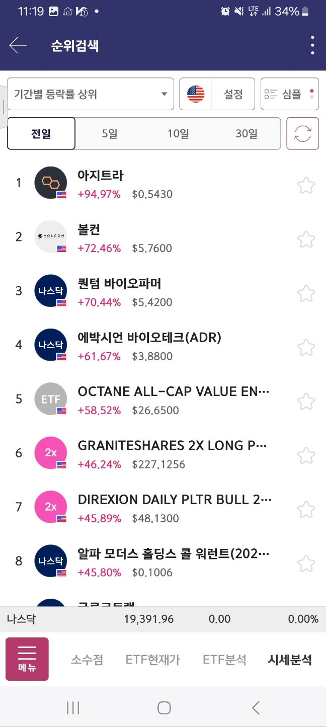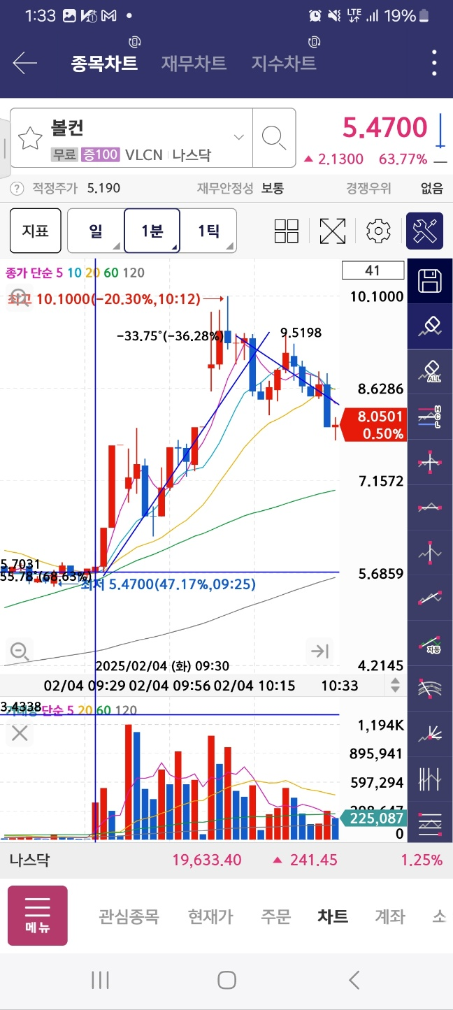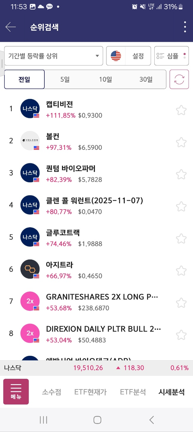 개장 후 거래 들어온 종목. 개장 후 300프로 가까이 상승. 초반 98프로 상승 후 25프로 하락. 다시 98프로 상승 후 10프로 하락.