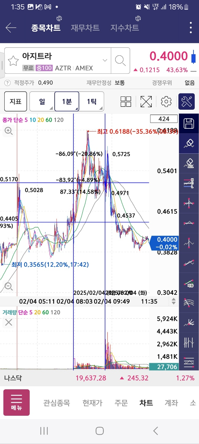 개장 직후 거래량과 함께 정지. 이후 개장시점으로부터 약 60프로 상승 후 36프로 하락.