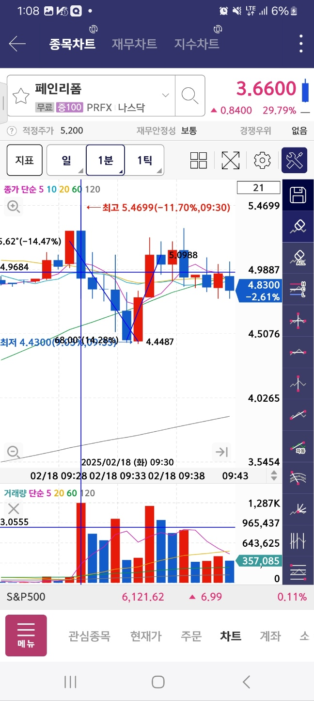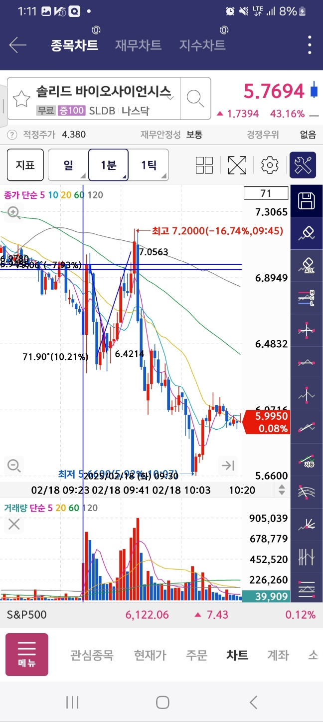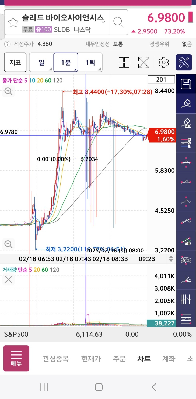 개장 직전 올라가는 종목. 개장 시점 8프로 하락한다. 그 이후 5분동안 35프로 상승. 이후에도 상승을 지속한다. 중간에 한번 멈춘다.