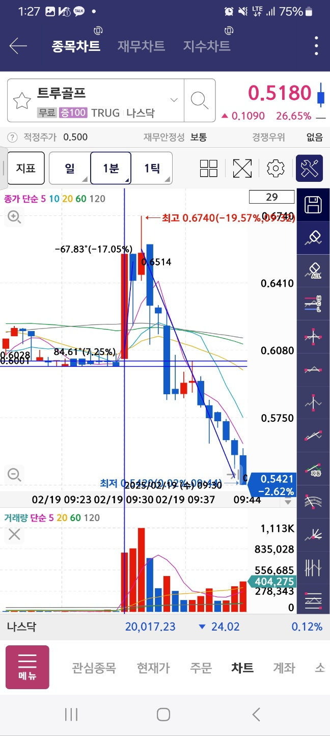 이미 사라진 차트. 개장 직후 7프로 상승 이후 17프로 하락. 하락시 13분 연속 하락함.