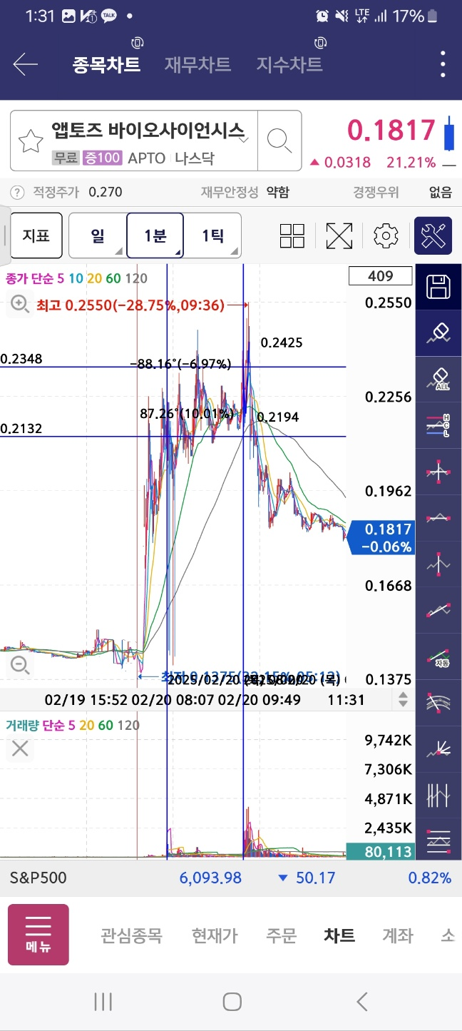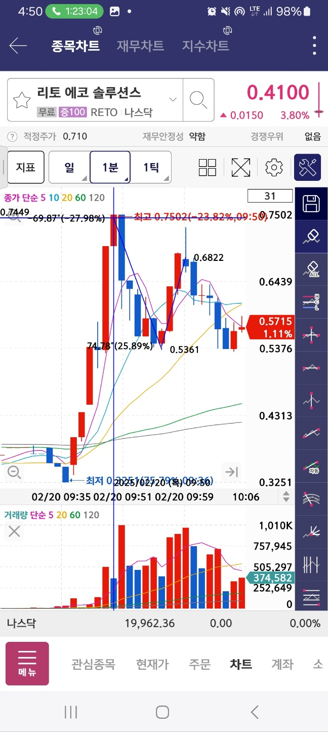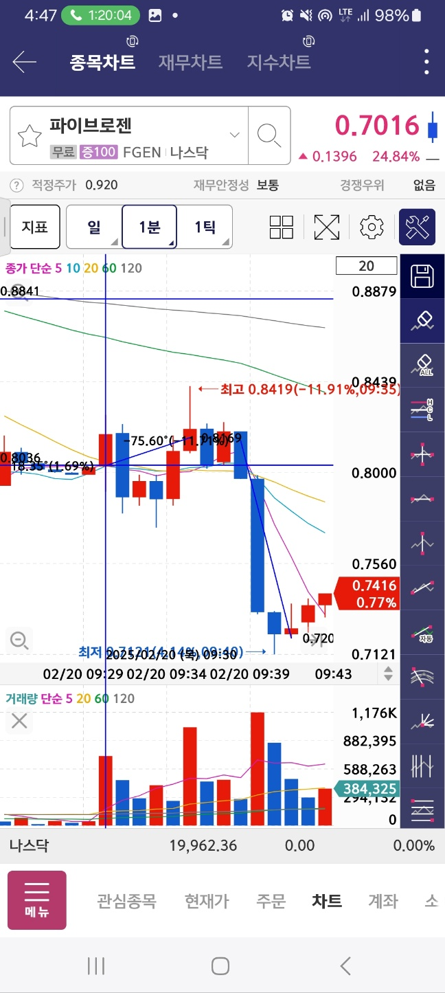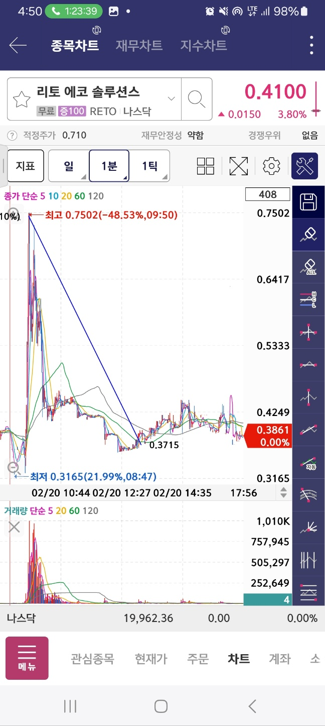 개장 후 상승. 12프로 하락 후 47프로 상승. 중간에 멈춘다.