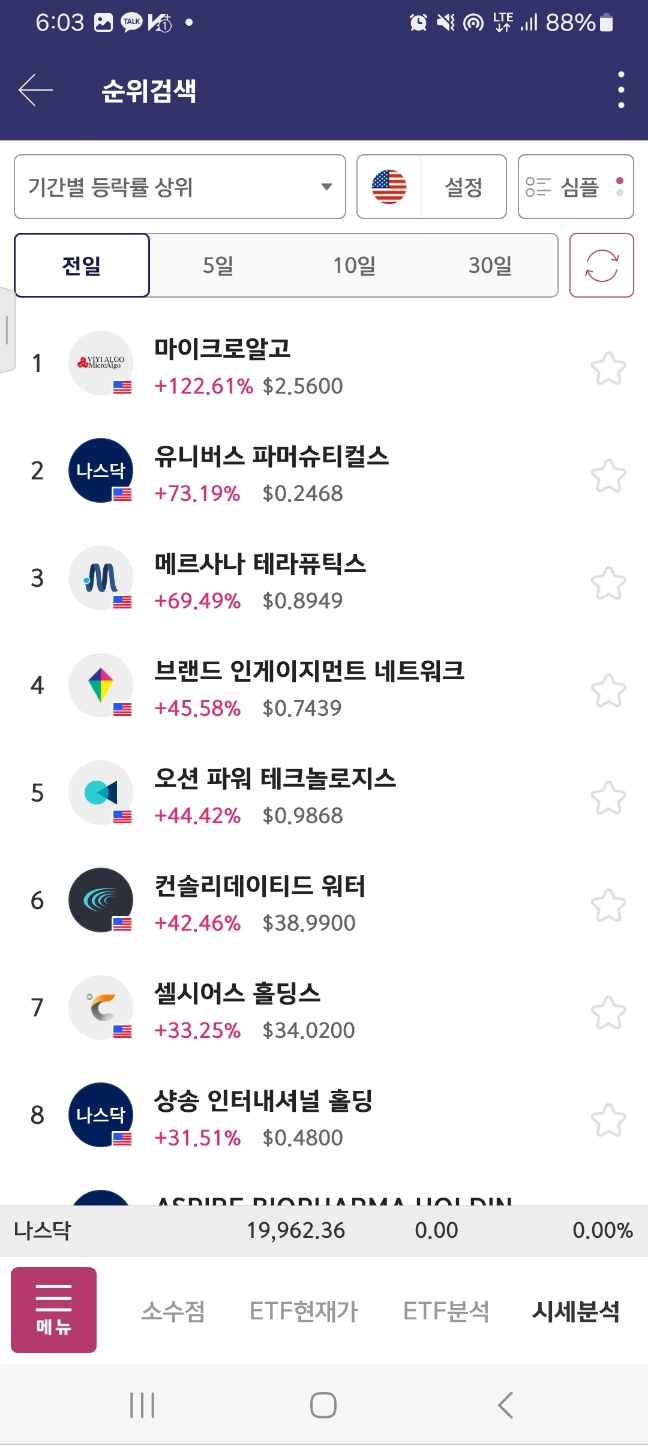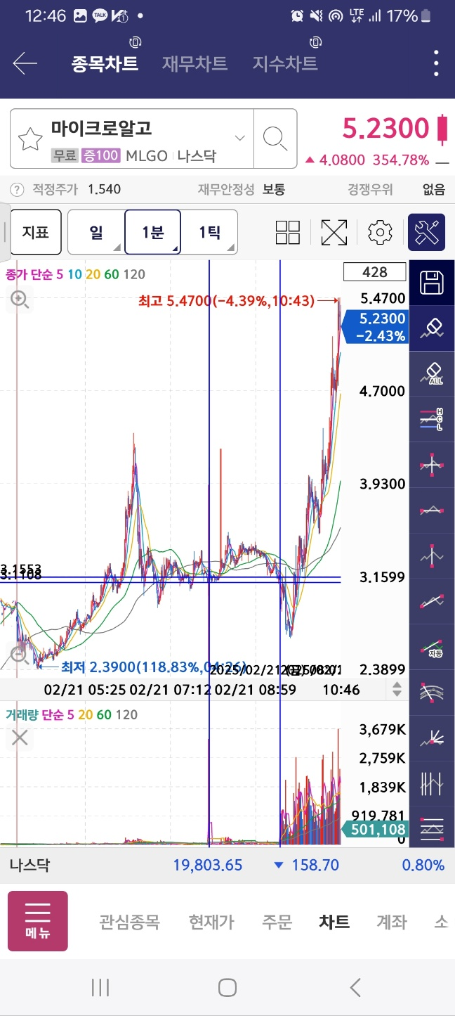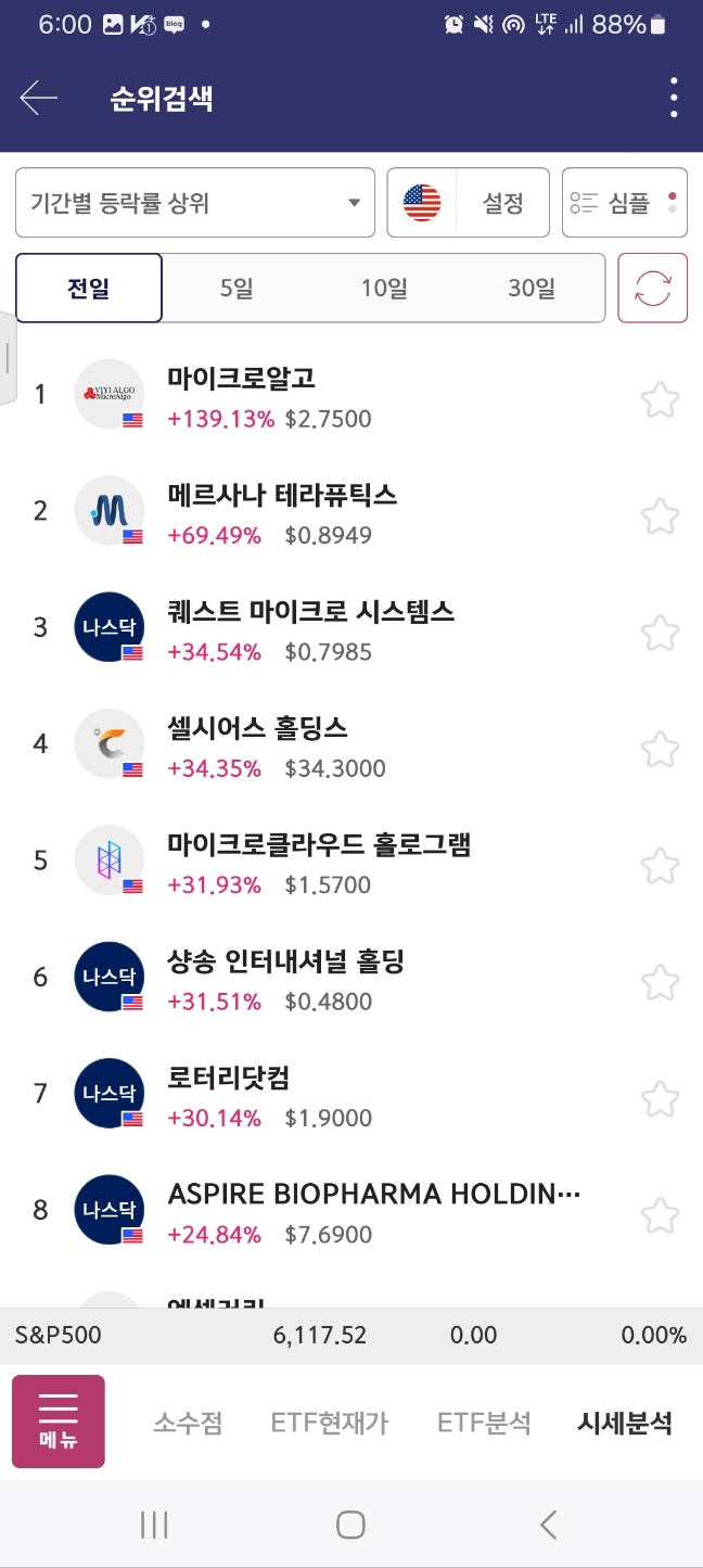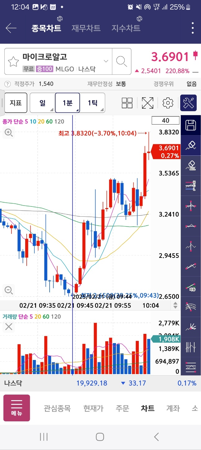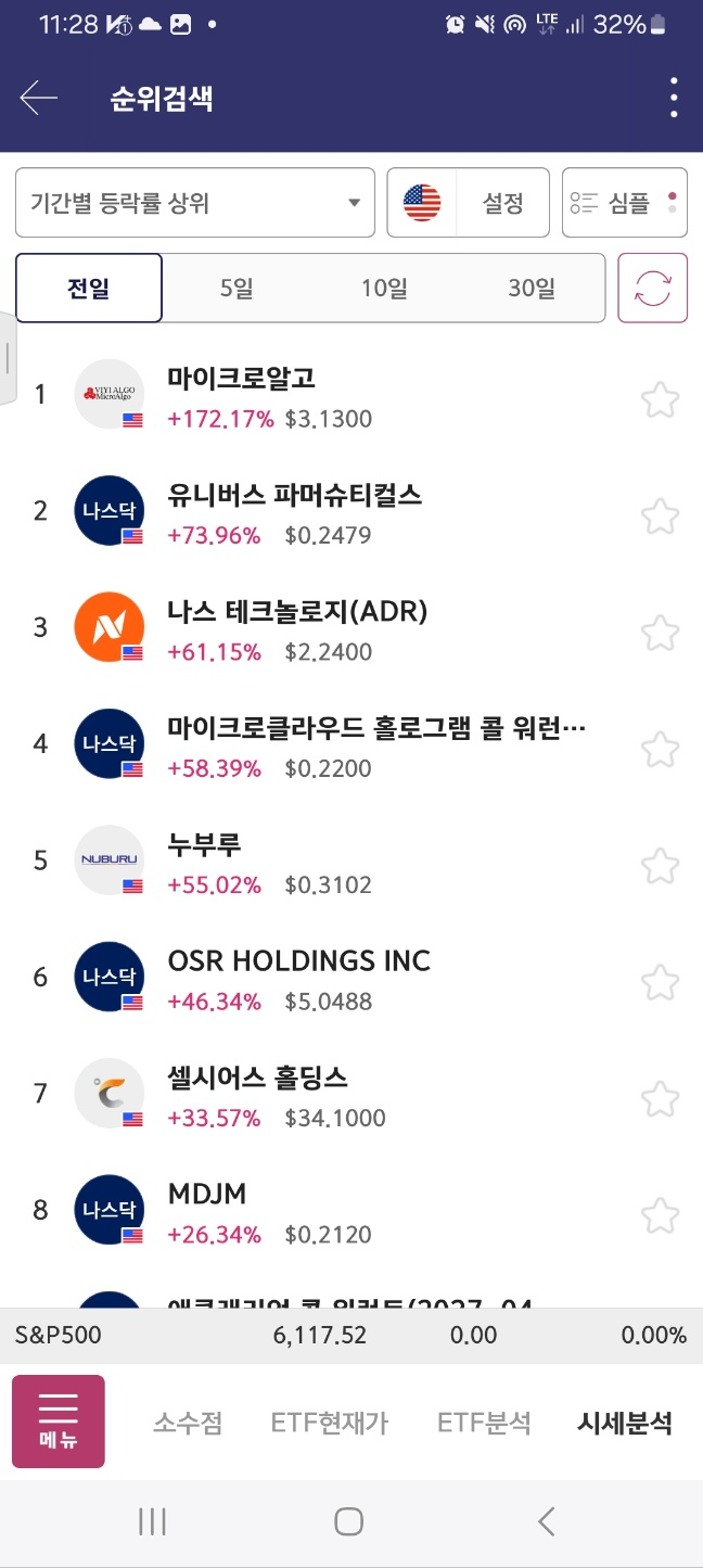 마이크로 알고 개장 후 올라온다. 개장 직후에는 14프로 하락하지만 이후 계속 상승한다. 이날 500프로 넘게 올라간다.