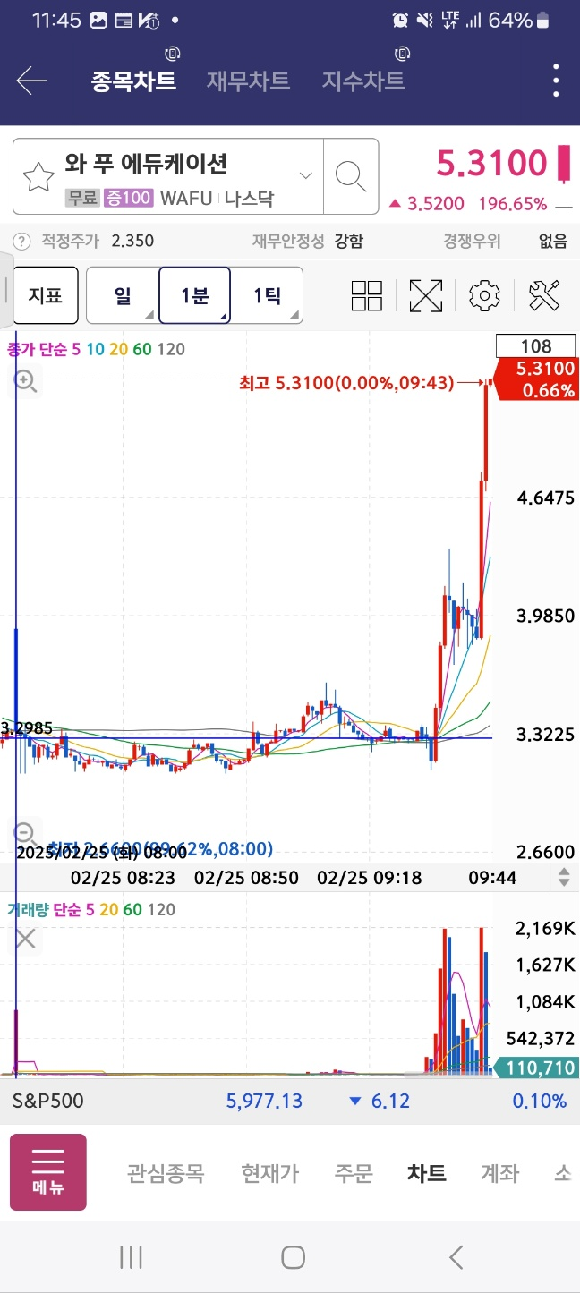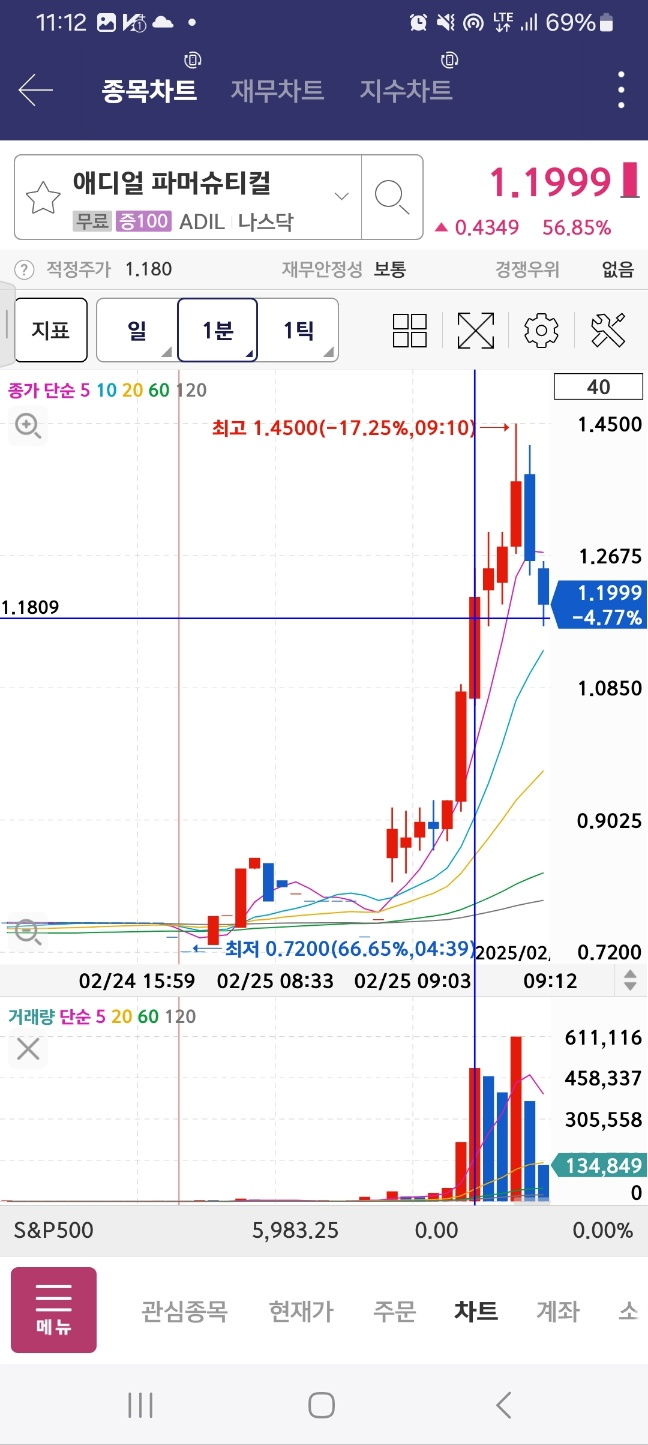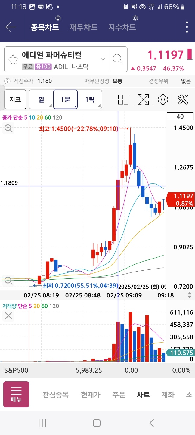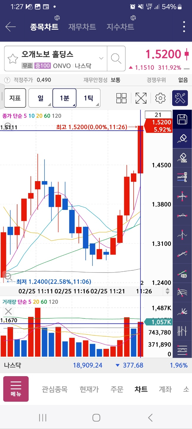 11시 시점에서 거래량 40만정도로 올라오는 종목. 멈추진 않고 상승한다. 4분간 상승세 유지 후 하락. 저음 인지시점 지점 꺠짐. 이후 하락.