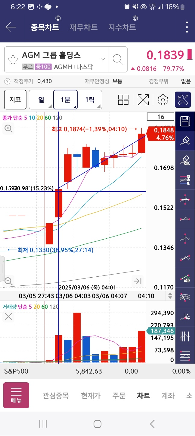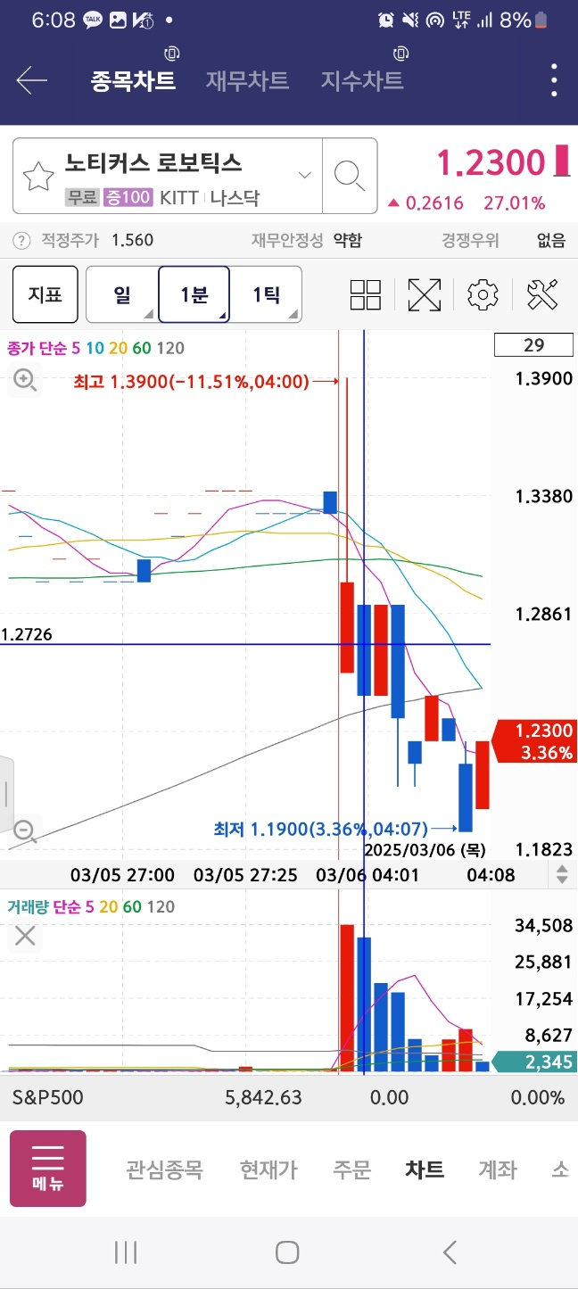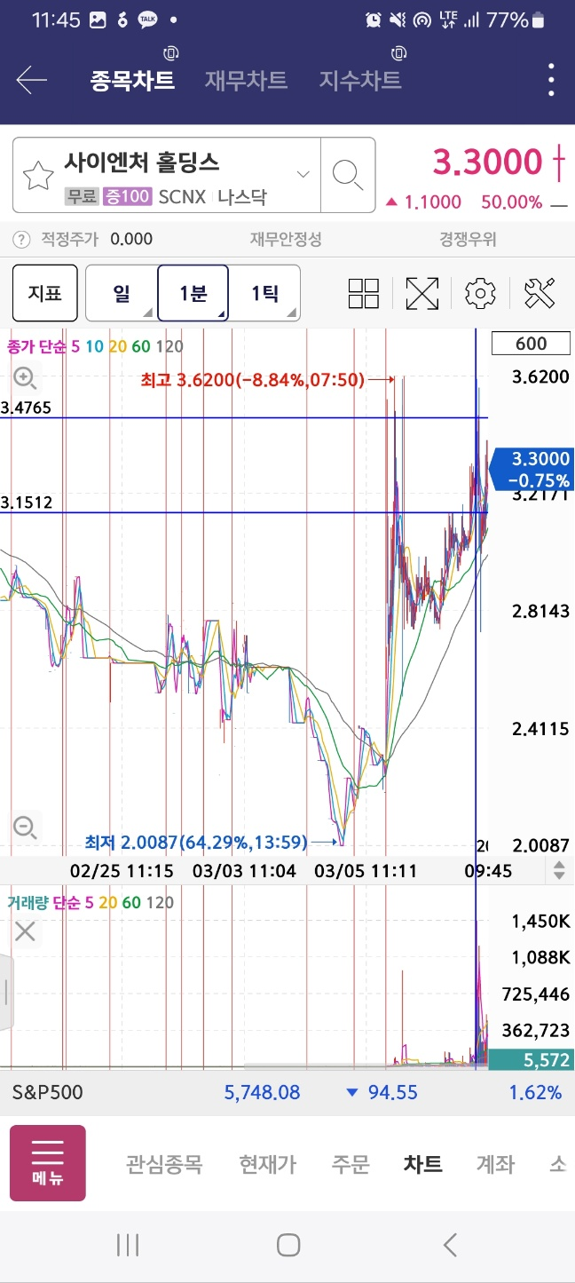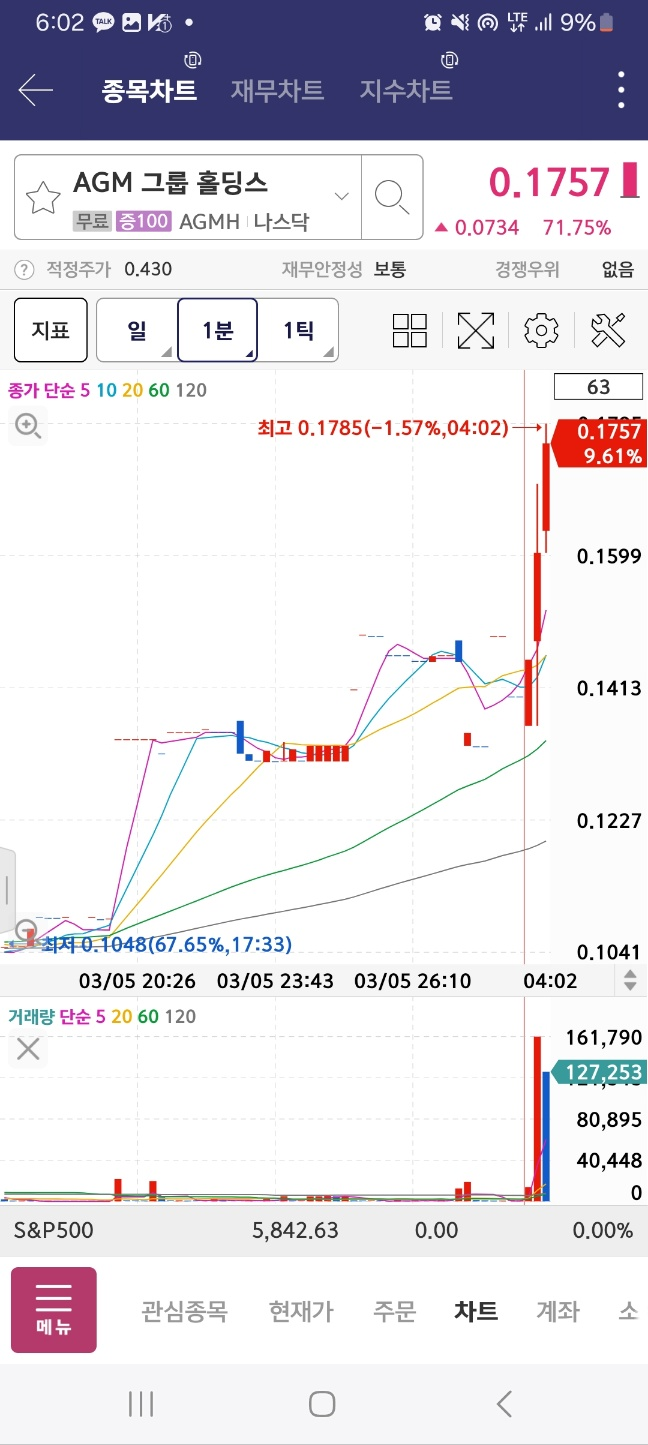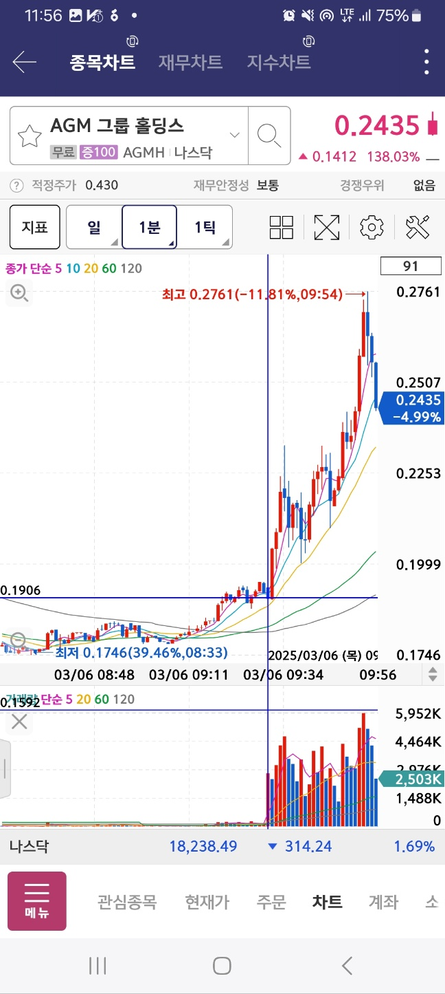 1분 시점에서 agm이 올라온다. 거래량은 10만정도이다. 노티커스는 하락한다. 반등 있을때까지 잡는다.