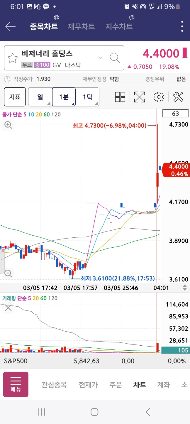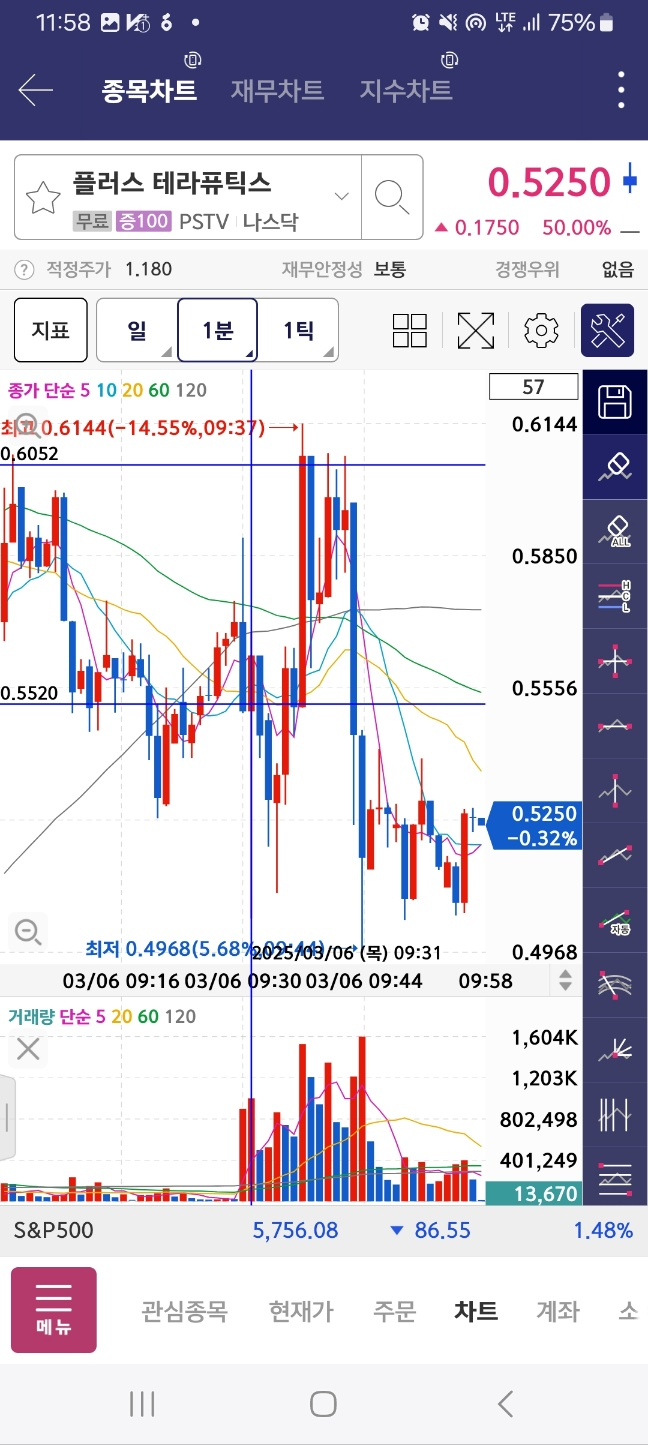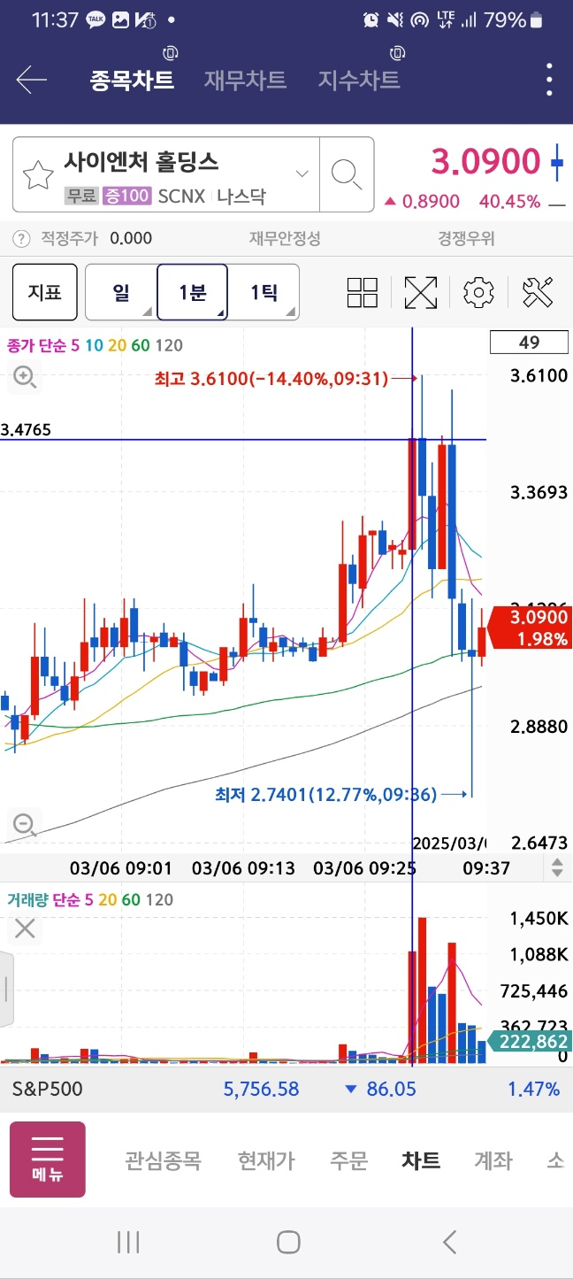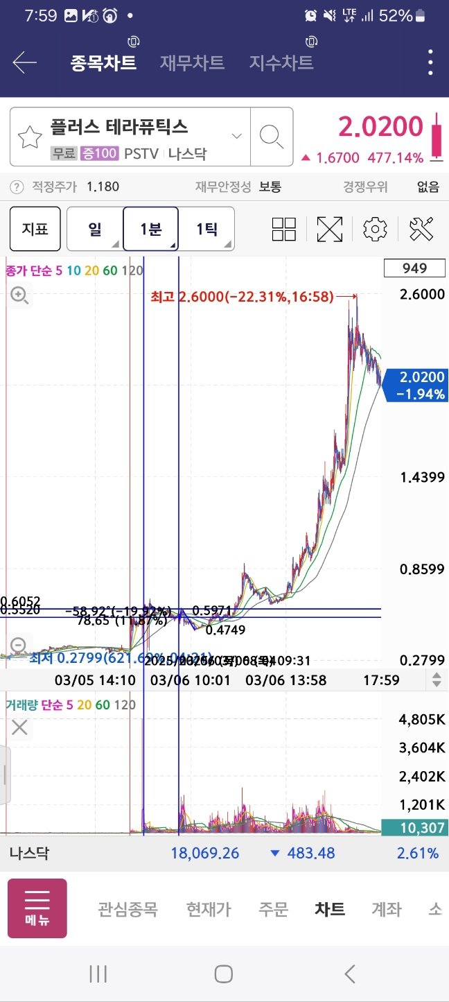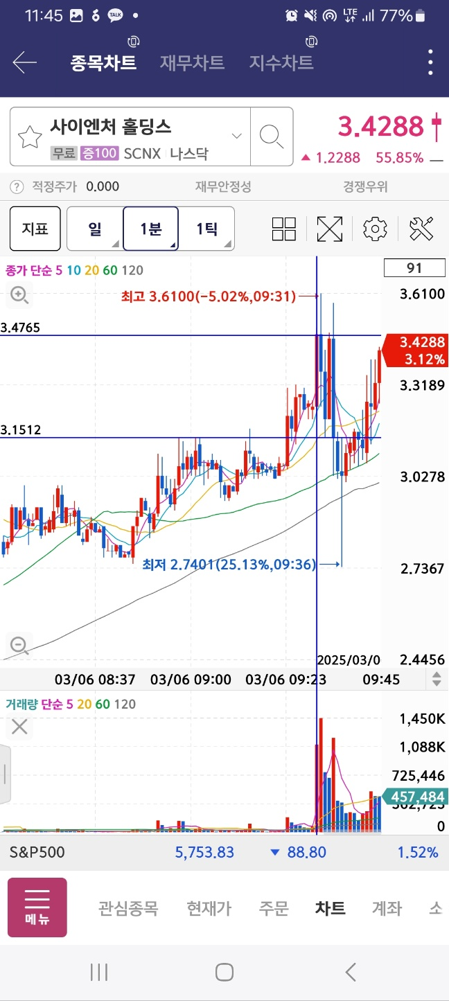 플러스 개장 1시간 15분 상황. 결과적으로는 이후에 추가상승하면서 저점 대비 5배 상승한다. 거래량은 10시를 넘지 못했지만 지속 상승한다.