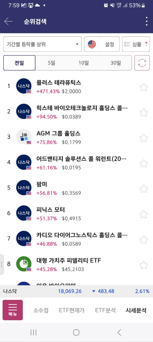 agm은 24분 상승 후 하락. 이후 계속 하락한다. 4위로 시작한 플러스. 개장 후 하락. 상승. 다시 급하락 반복한다.