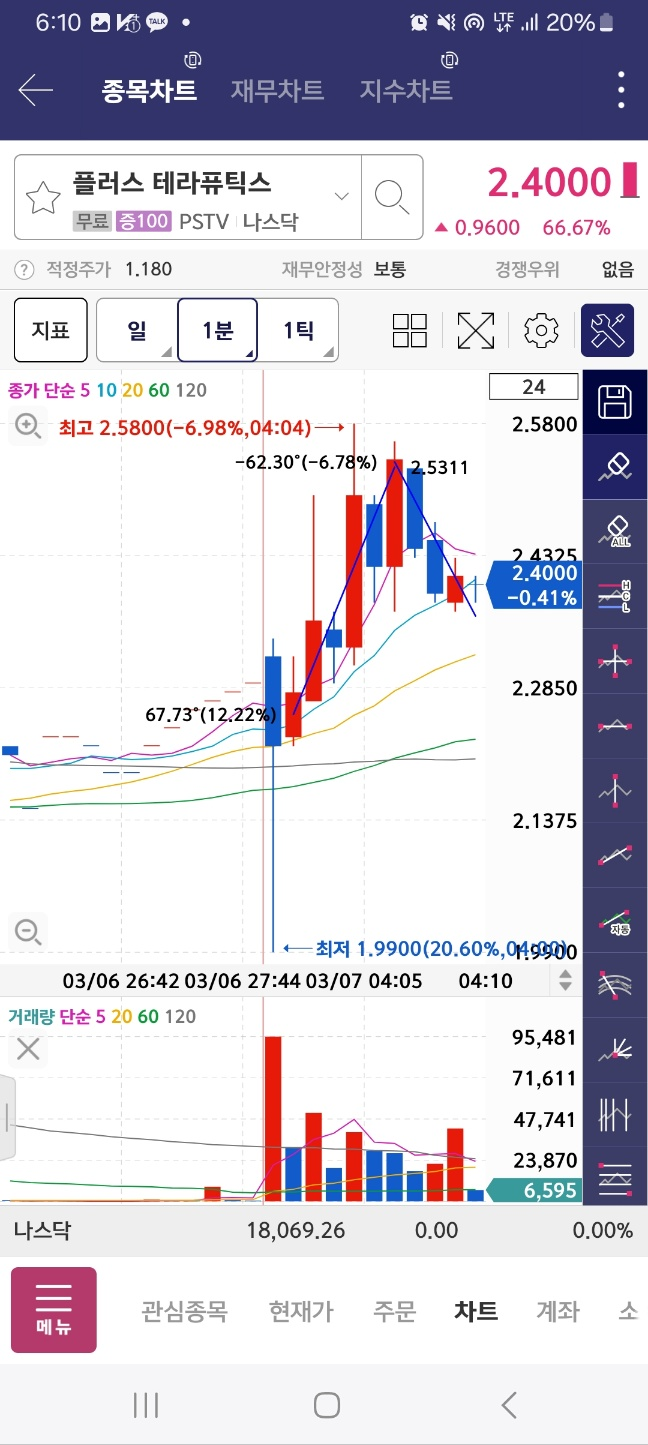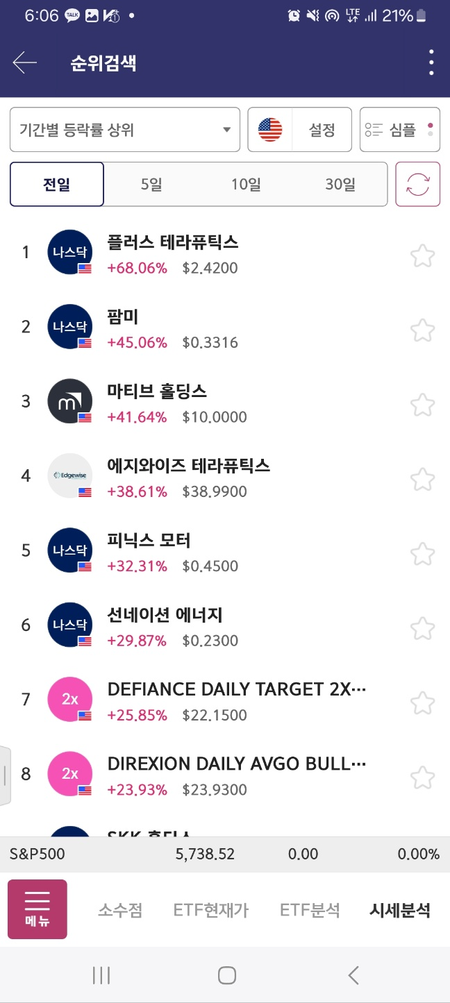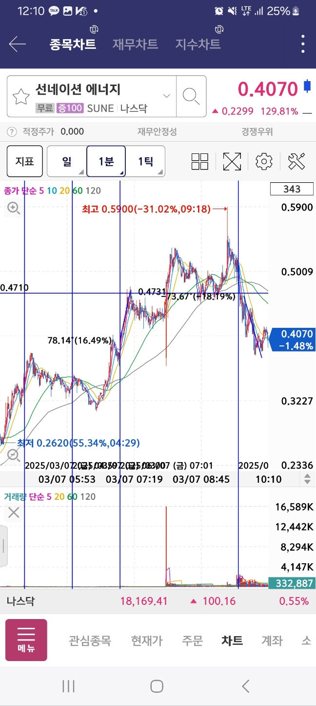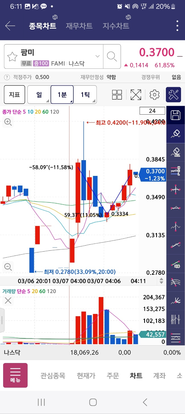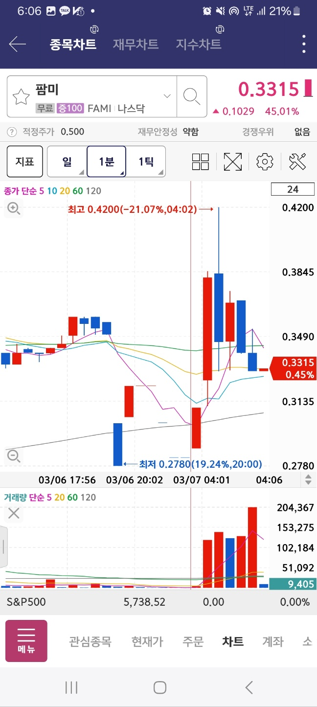 10프로 정도 상승 이후 하락한다. 6분에는 팜미가 거래량 20만에 급락한다. 급락 시점에서 10프로 가량 상승한다.