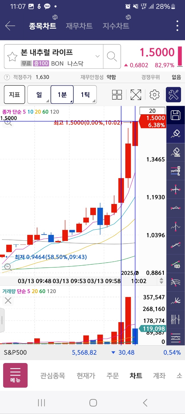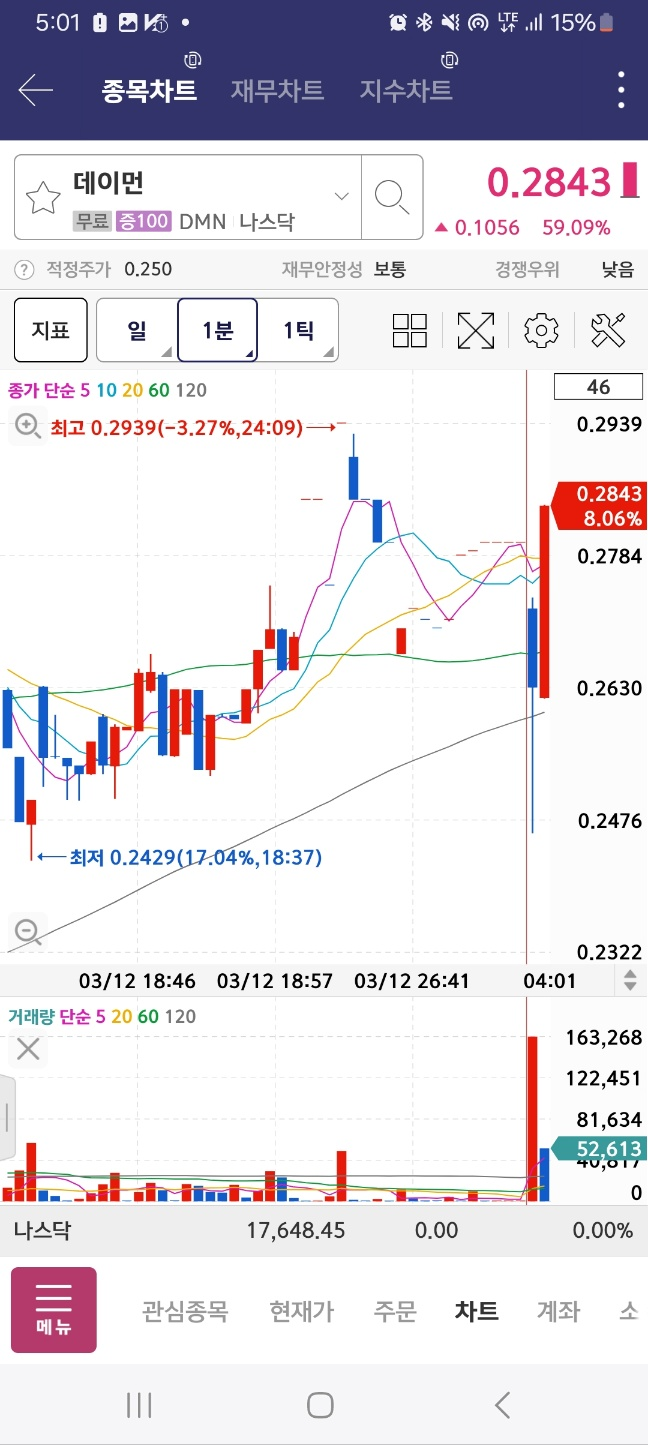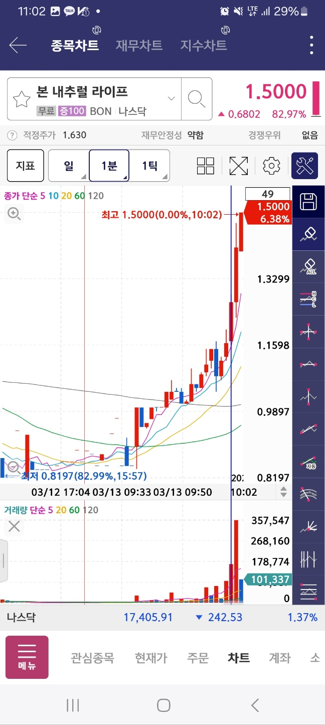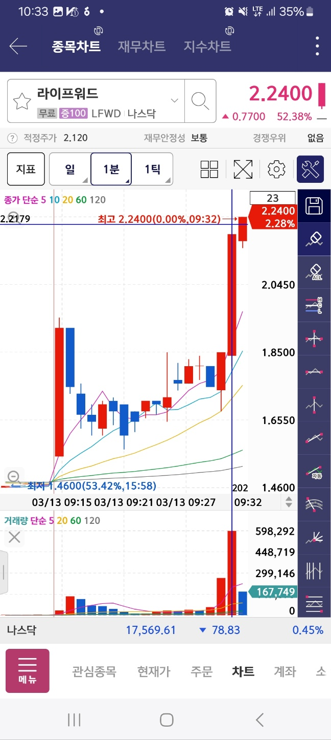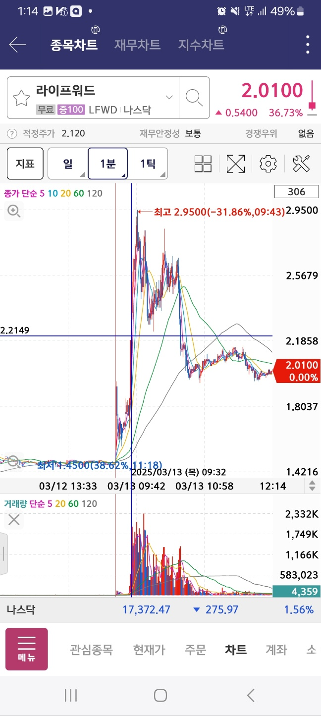 라이프워드는 7분간 상승. 이후 5분 하락. 다시 5분 뒤 상승. 이후 급락하며 마무리.