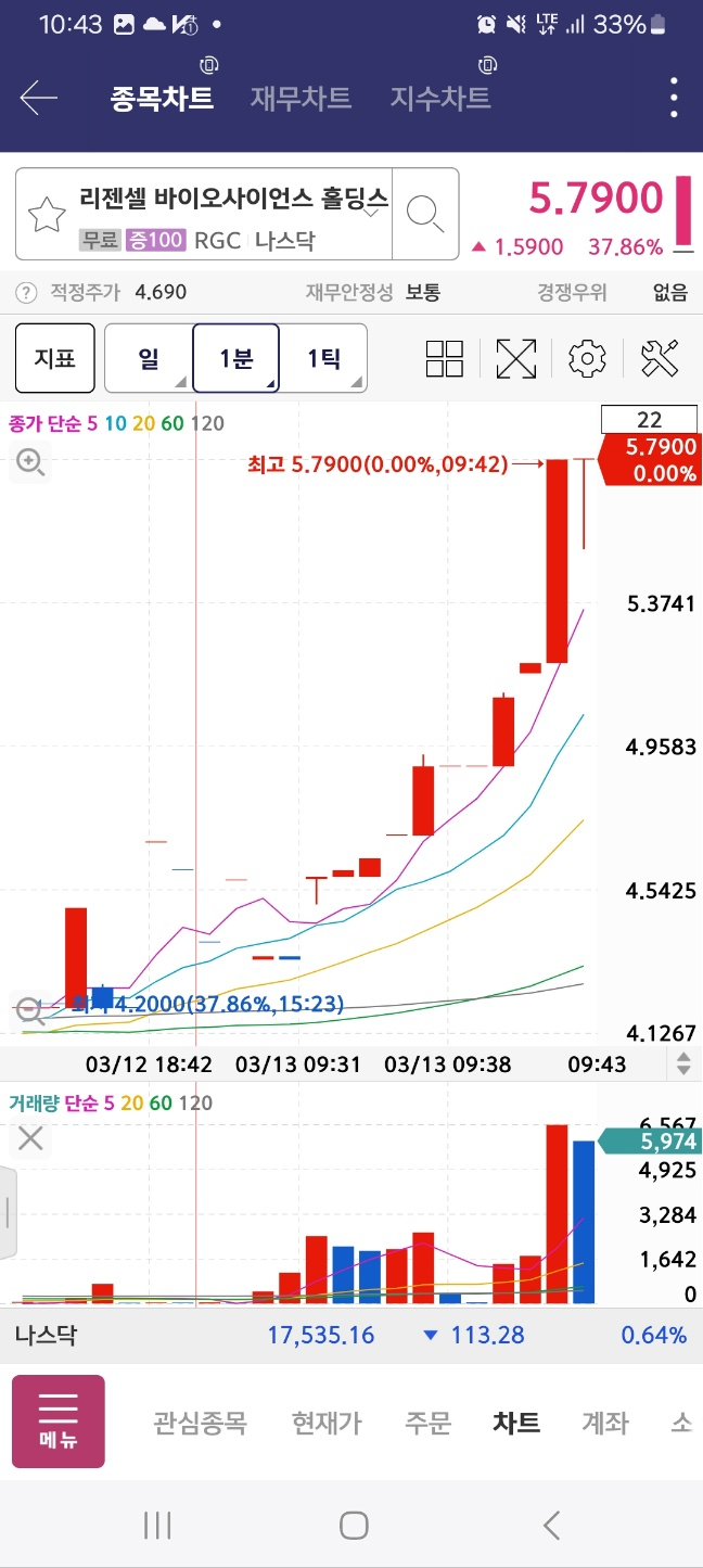5분뒤 재개. 같이 멈춘 리젠셀. 거래량이 적어서 이건 안들어갔다(하지만 결국 이 종목이 고점 갔다)
