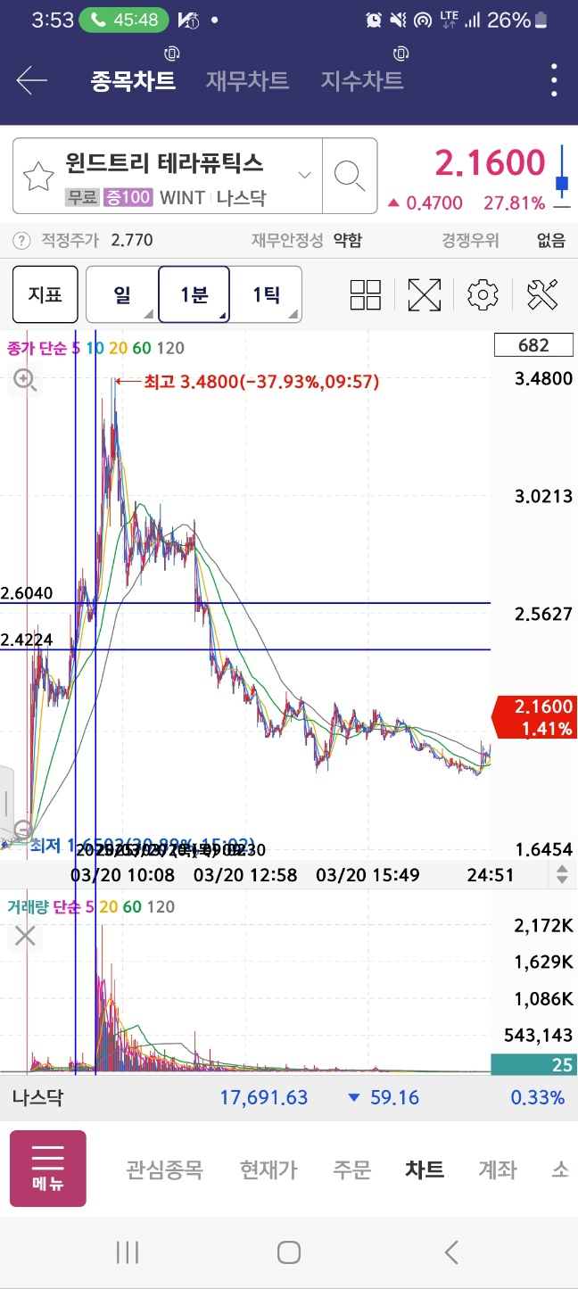 윈드트리. 초반에 수급있고, 개장 후 수급들어온다. 이후 상승을 지속하며 10분간은 상승한다.