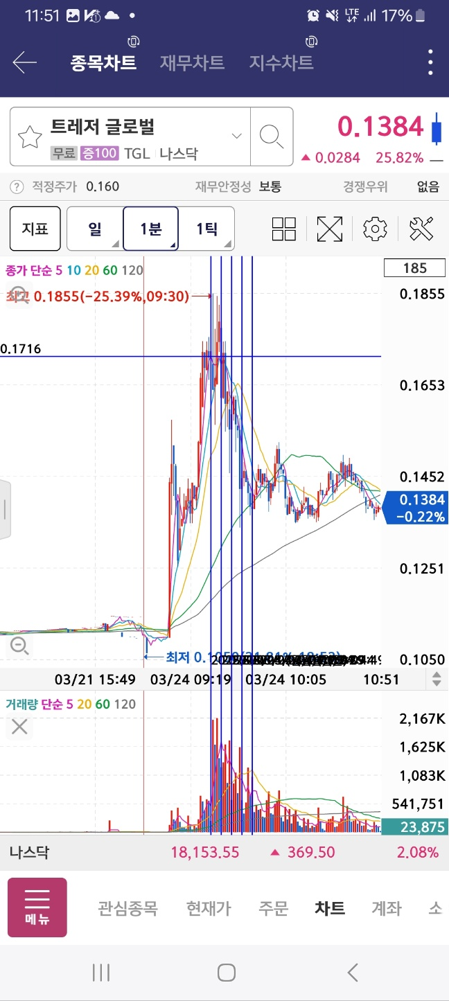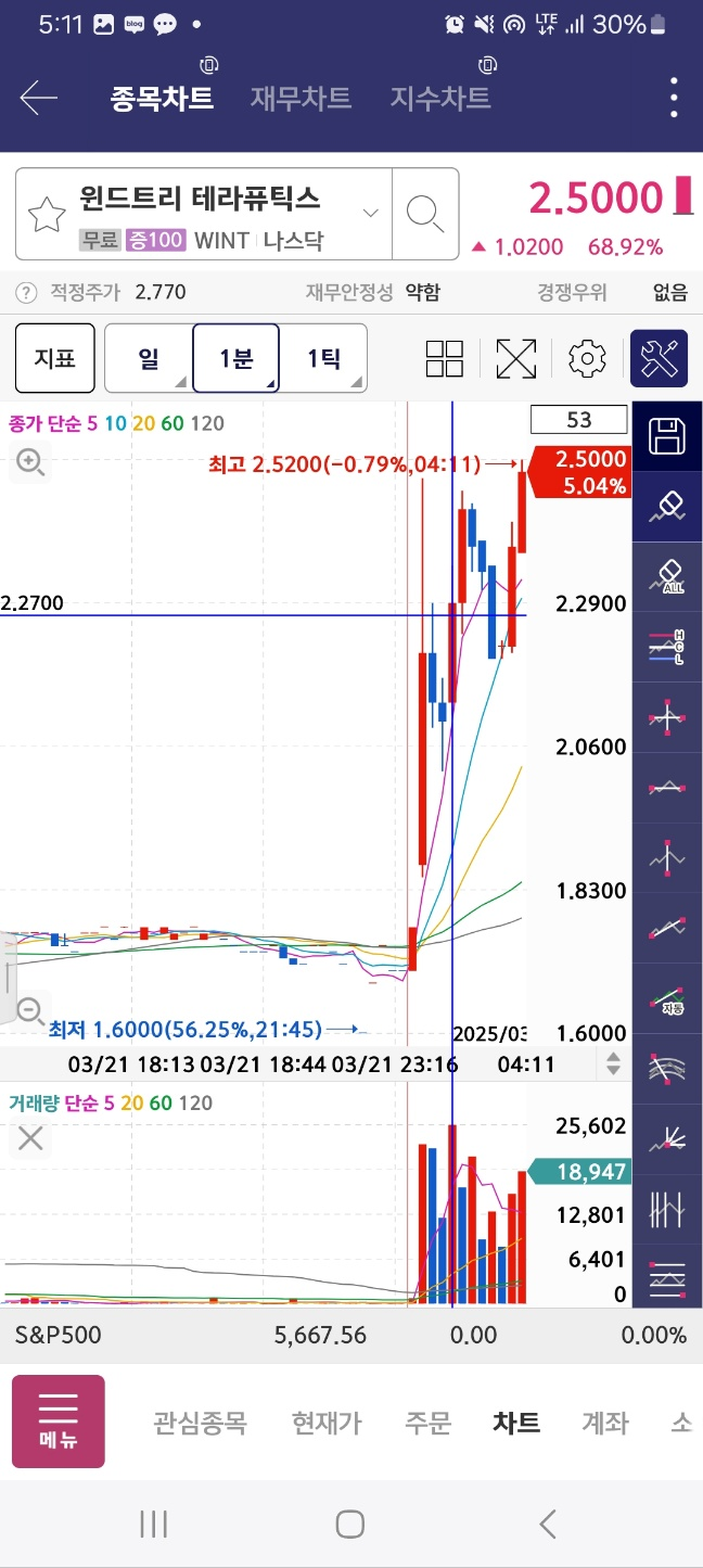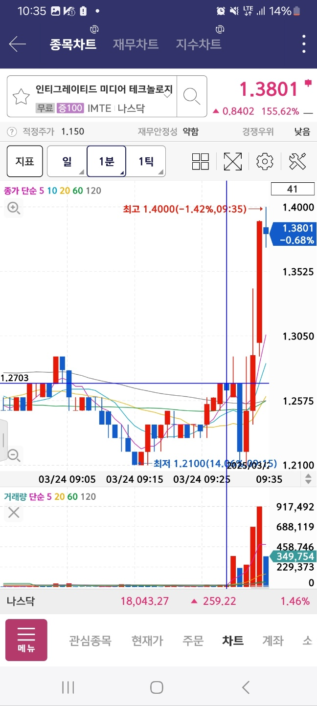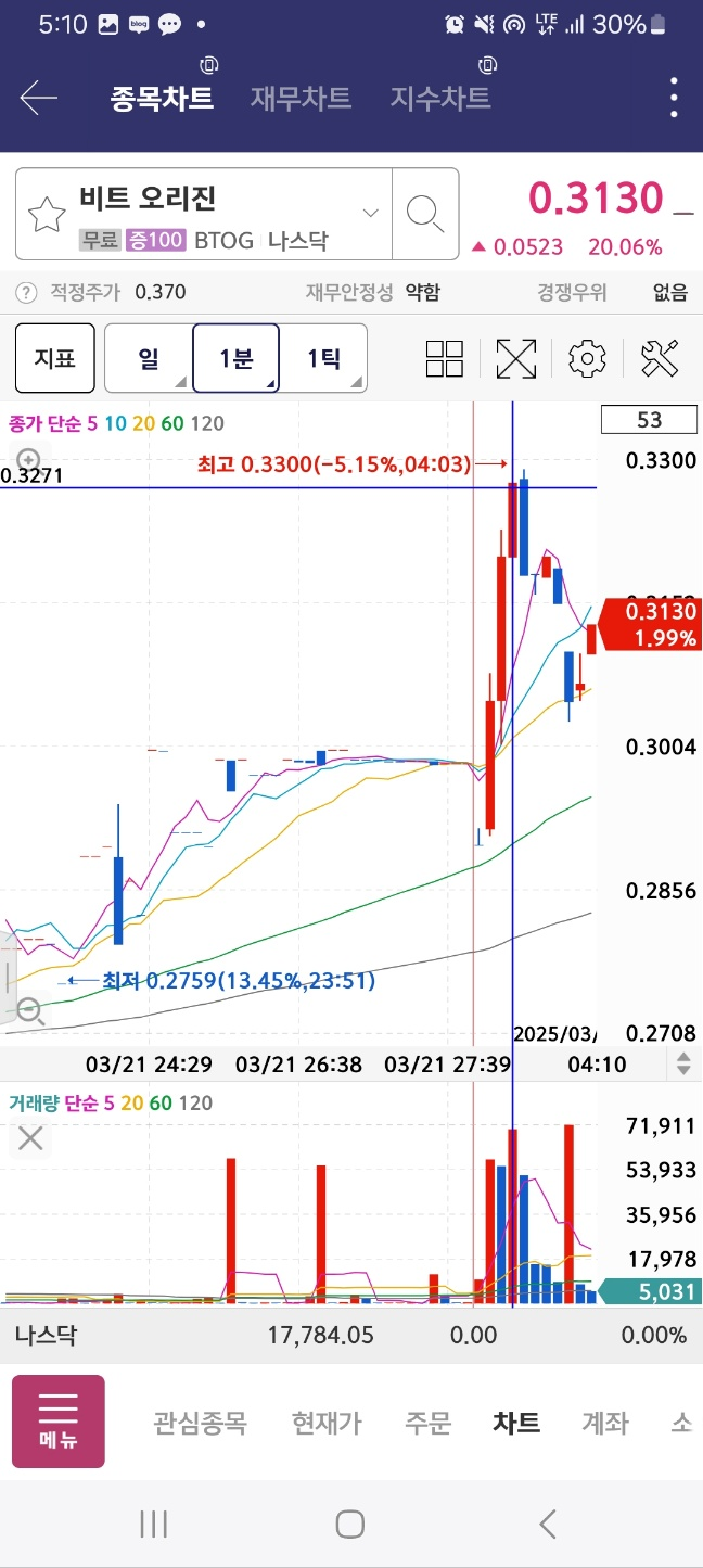 70프로대에서 시작. 개장 후 거래량 들어온 종목. 1000k 넘음. 직후 하락 이후 지속적으로 상승. 5분, 10분, 15분, 20분 계속 상승.