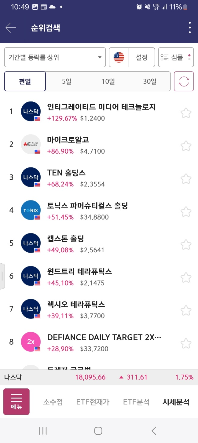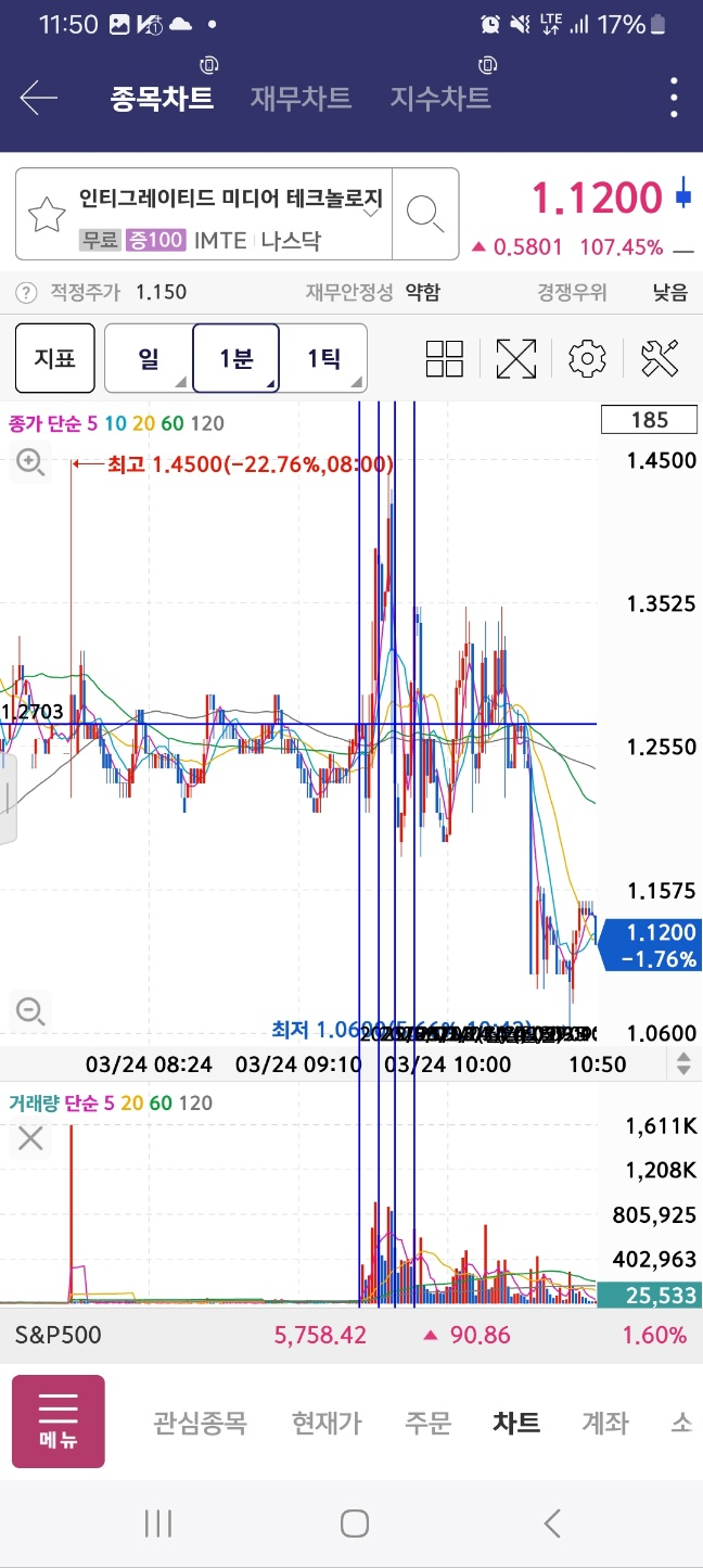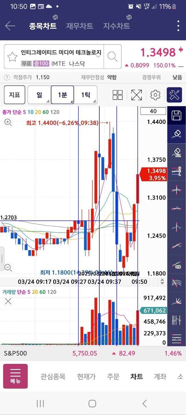 가장 높이서 시작인 인티. 거래량은 100k는 안됨. 개장 후 하락. 이후 3분간 상승.