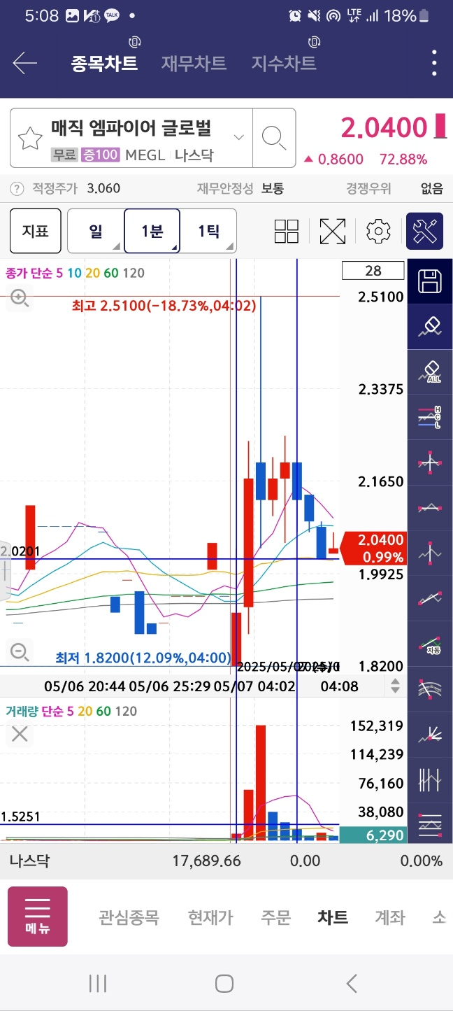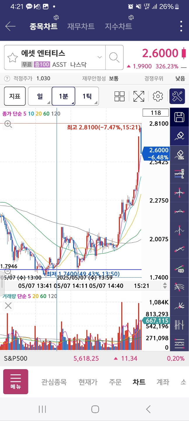 7분 지점을 넘어서서 올라간다. 고점은 6시 조금 넘어서 기록한 뒤에 하락한다.