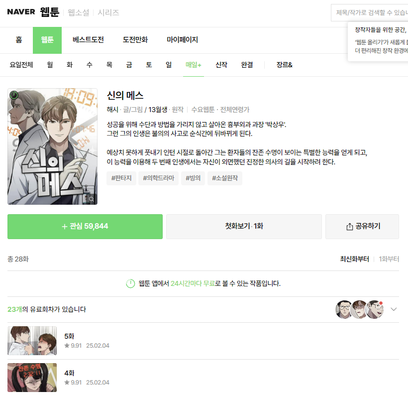최근 시작한 네이버 웹툰 신의메스이다. 소설 원작이며 아직 연재중이다.