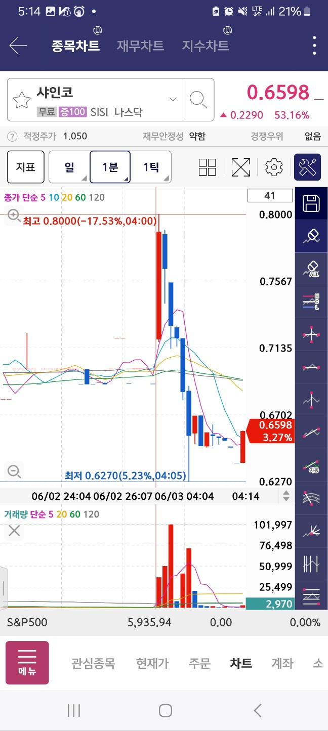 5시 거래의 특징은 종목 선정 / 그리고 무조건 1분 안에 마감해야 한다. 매수 건 가격 기억하고 매도 걸기. 짧게.
