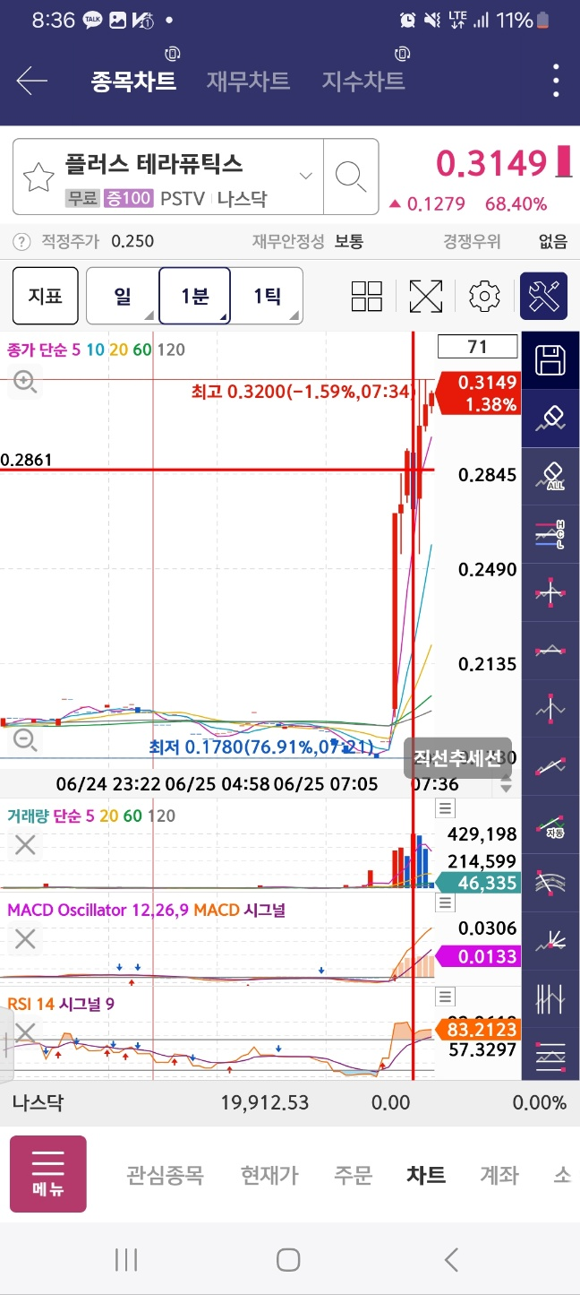 0830 / 새롭게올라오는차트/ 상위권의 체크 / rsi macd다 좋음 // 이경우 좀 들어갈만함 / 변동성 크게 흔들리니 아래에서 잡아서 올리기 /아래꼬리가 긴편이다.