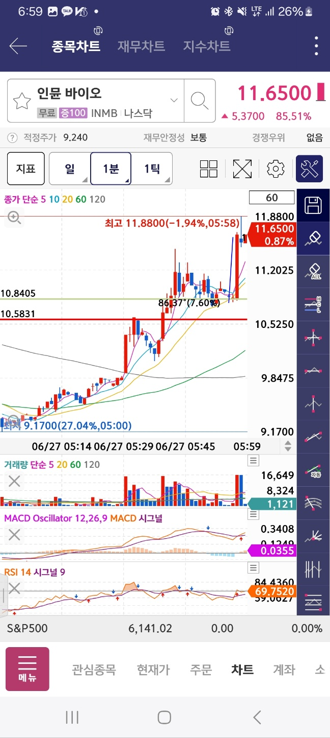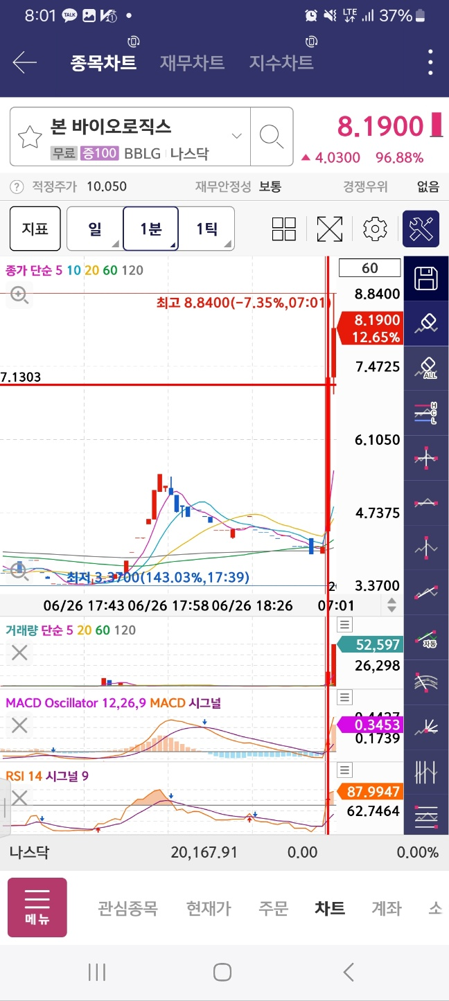 0800 본바이오로직스 / 종목등장 / 개장하고 처음 등장 // 시작 지점에서 rsi macd 고려시 지속 // 흐름이어서 150까지는 간다 / 결과적으로 0분에서 가장 저점 / 내렸다 올리진 않음.