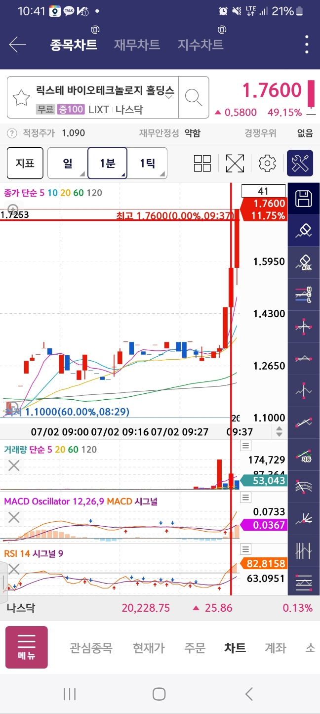 쭉 올라오는 종목 / 하지만 나느 이거 잡긴 어려웠을 듯. 거래량이 많긴하다. 일봉이 3000K정도 나오면 40억 넘는다.