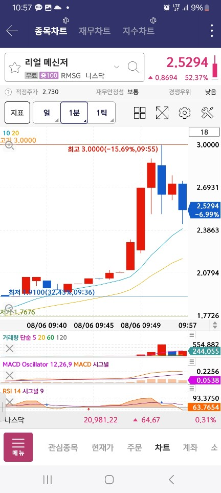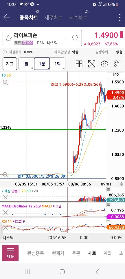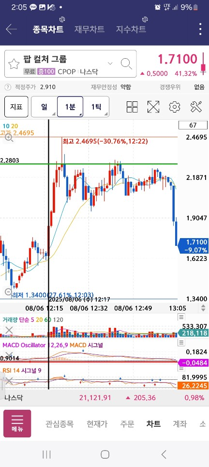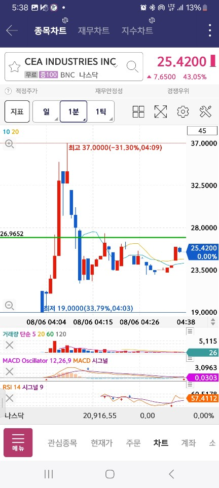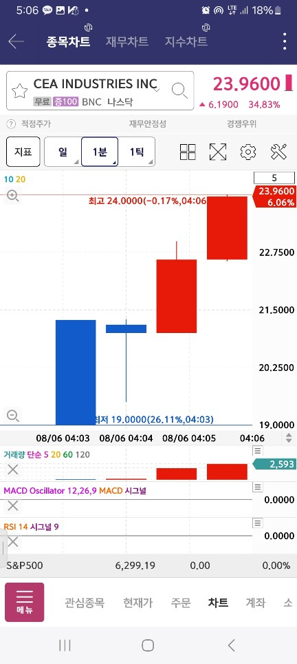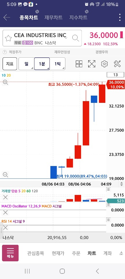 5시에 올라오는 게 없어서 기다리다보니 / 중간에 수량 적게 100찍은 종목이 나옴 / 매수세 2봉 들어오고 내려간다