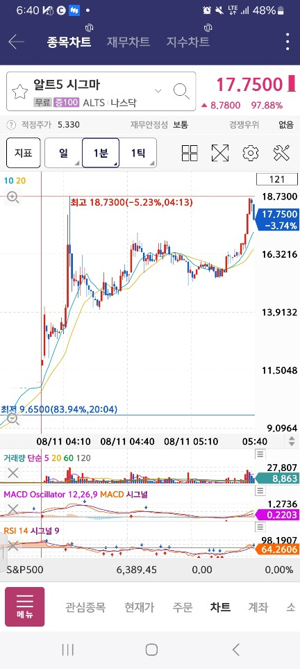 알트5시그마 / 개장 하고 너무 잘 가다가 8시에 급락하는데 봉 4개로 60퍼 가까이 뺴버림