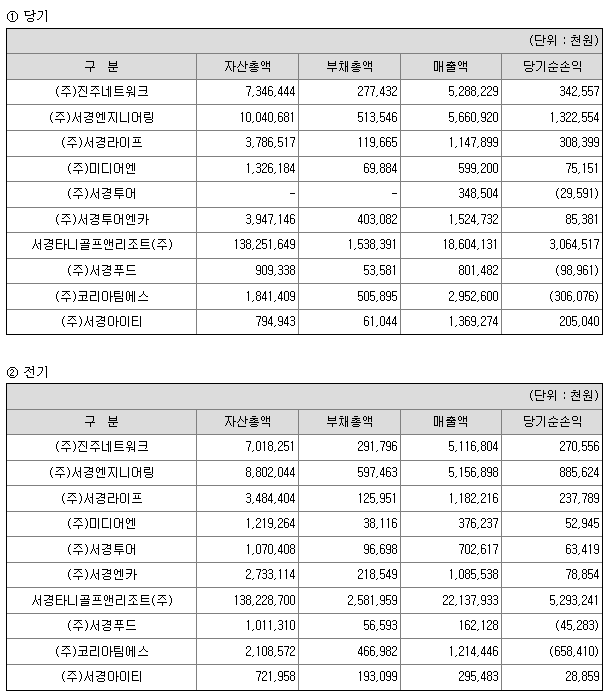 엔지니어링과 골프에서 수익이 발생한다. 서경 타니 cc (사천에 위치한 골프장이다.) 결과적으로 영업이익 대비 당기순이익이 매우 높았던 것은 골프장 수익이 높아서인 것으로 보인다.