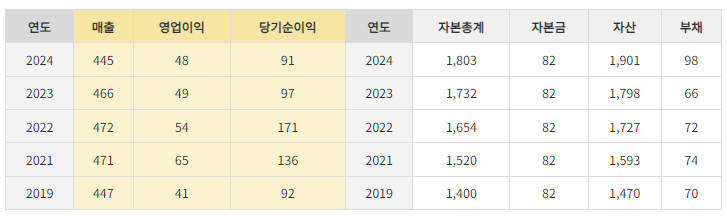 | 연도 | 매출 | 영업이익 | 당기순이익 | 연도 | 자본총계 | 자본금 | 자산 | 부채 |