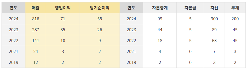 | 연도 | 매출 | 영업이익 | 당기순이익 | 연도 | 자본총계 | 자본금 | 자산 | 부채 |