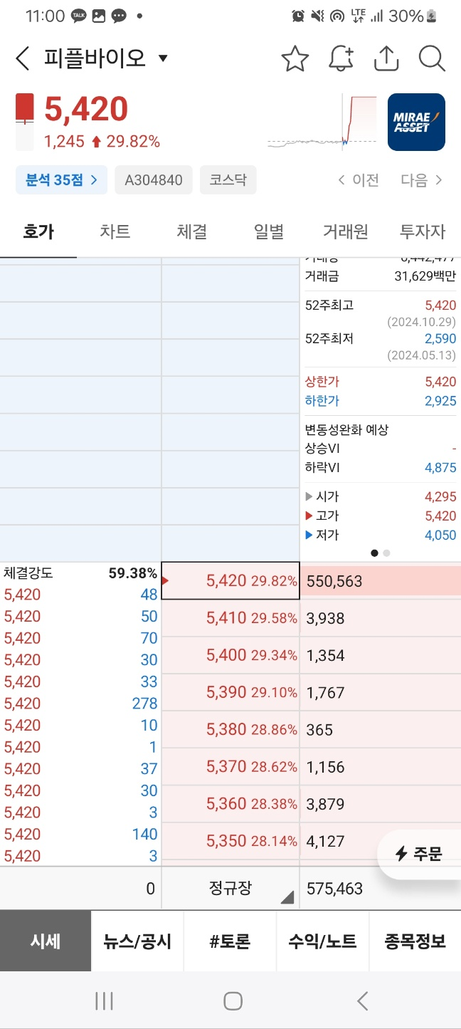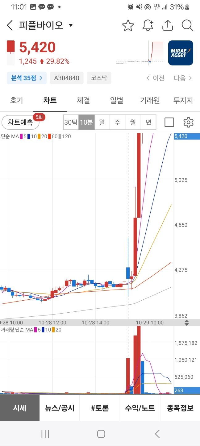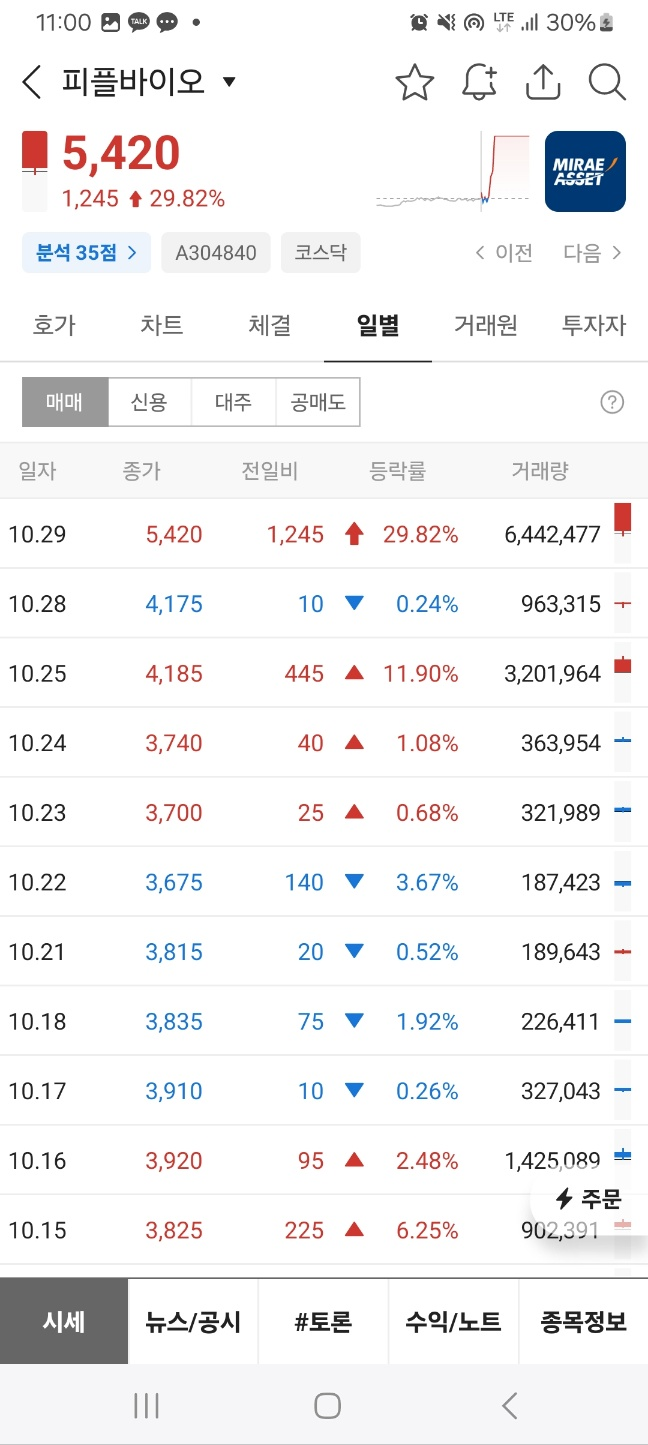 11시에만 구매대기 55만주이다. 상장 초반에 비해 많이 빠진 상태인데 최근 보면 외인이 21만주 약 10억원 가량을 매수했었다. 이 이후에 4일뒤에 발표, 그리고 상한가 직행이다. 몇번 더 갈지는 모르겠다.