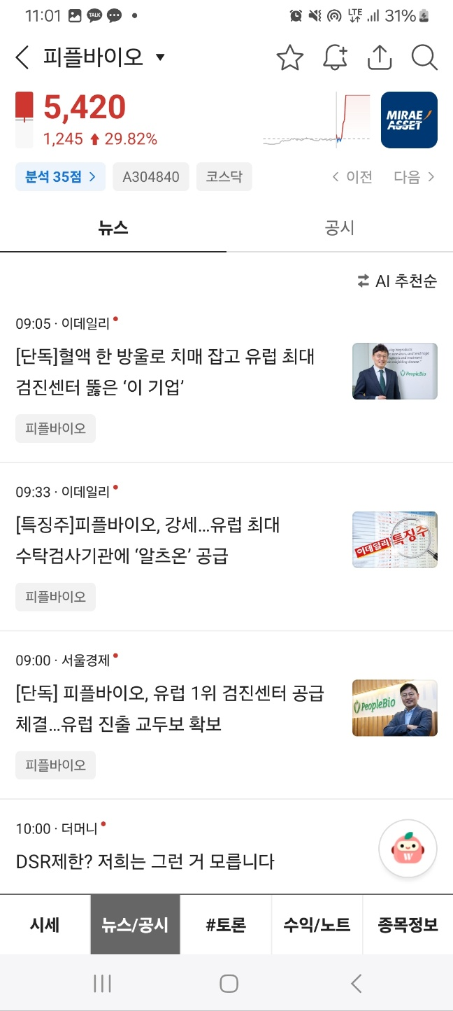 치매 진단관련주이다. 9시에 검진센터에 공급계약체결 뉴스가 나온 뒤에 바로 상한가가 되었다.