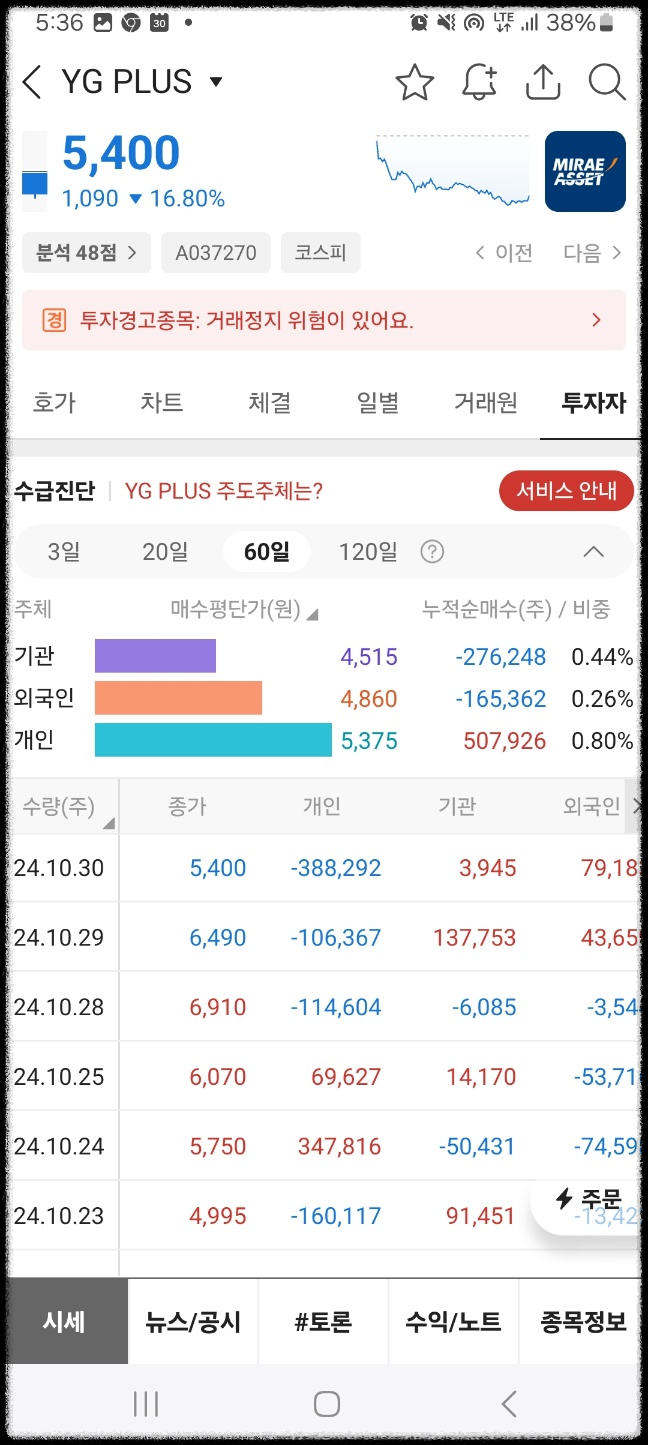 29일 30일간 개인이 넘긴 물량을 다 외인과 기관이 받았다. 오늘은 꽤 많이 하락했지만 추가적은 상승이 있을수도 있지 않을까.