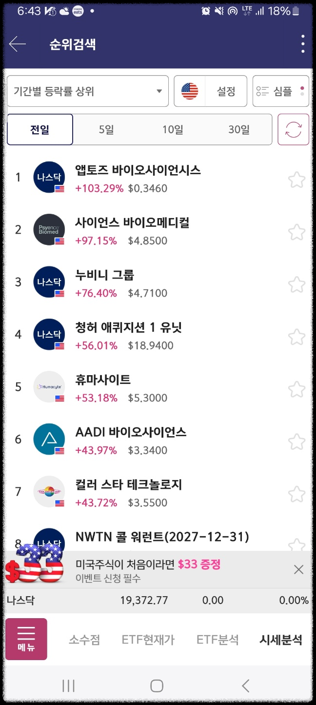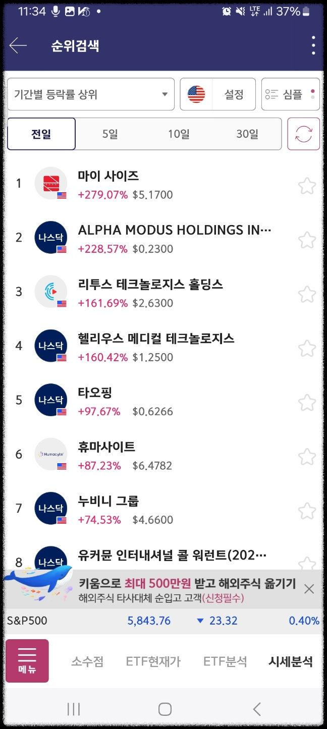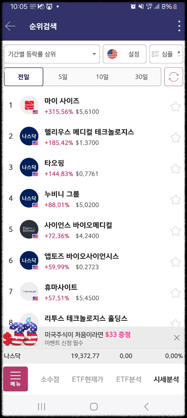 4분 지난 시점이다. 마지막은 다음날 마무리된 상황이다. 최종적으로 누비니가 올라왔다. 나머지는 하락했다.