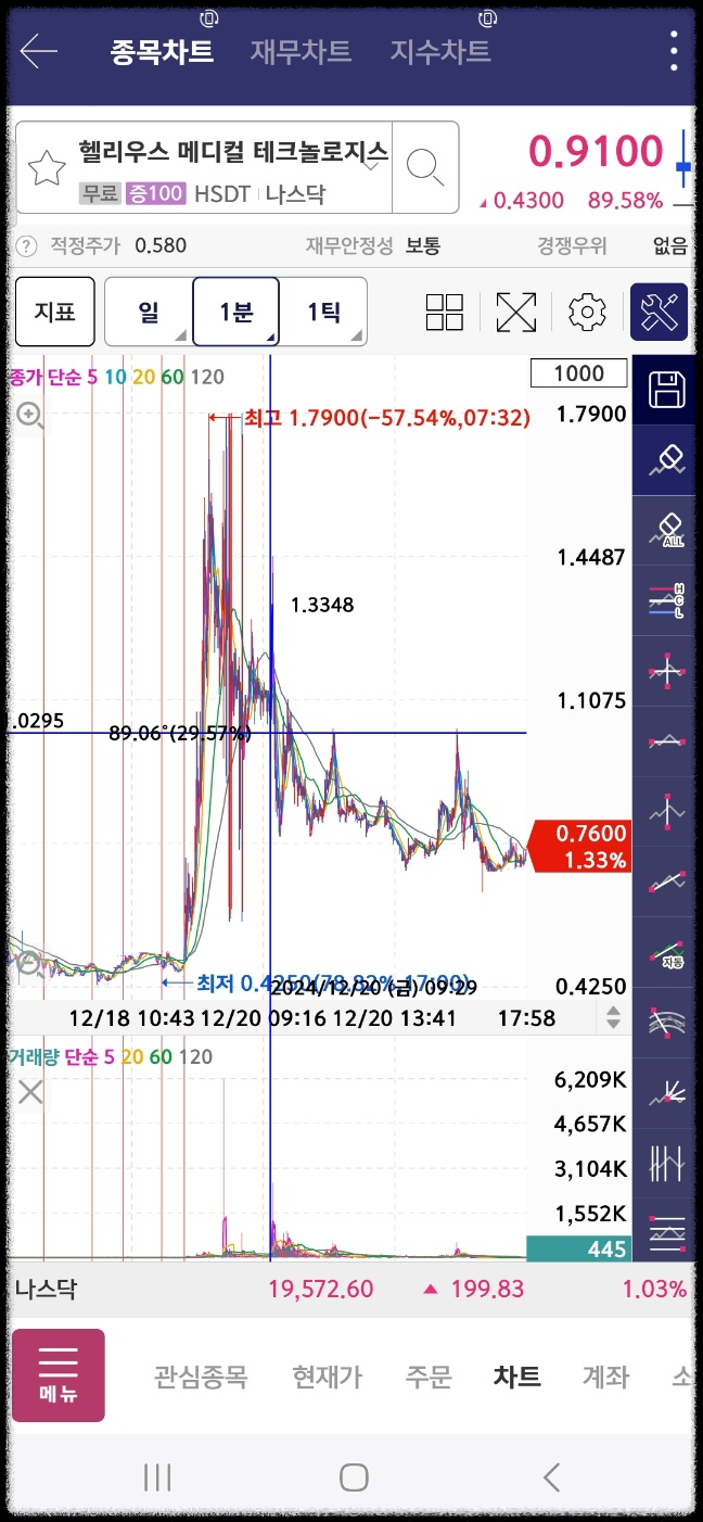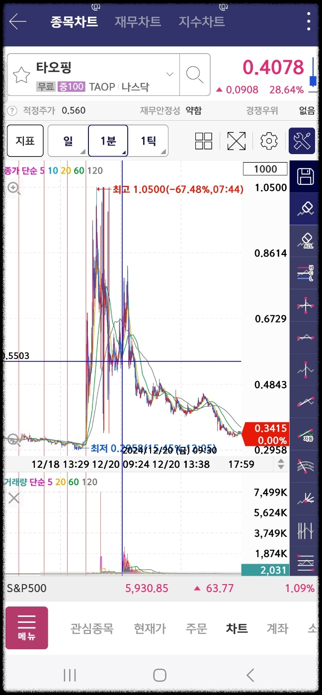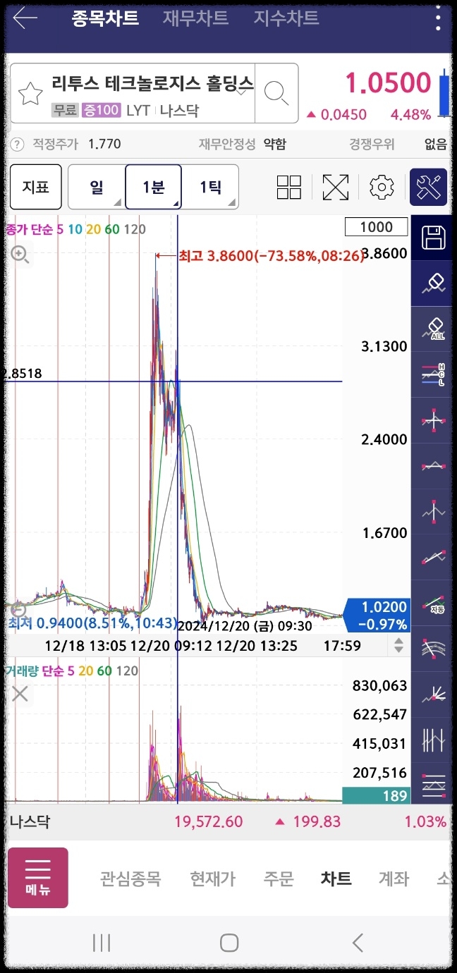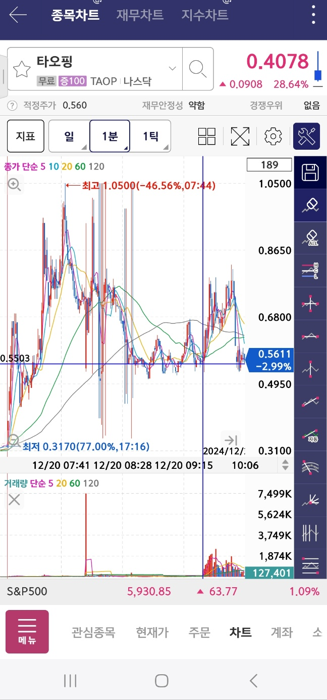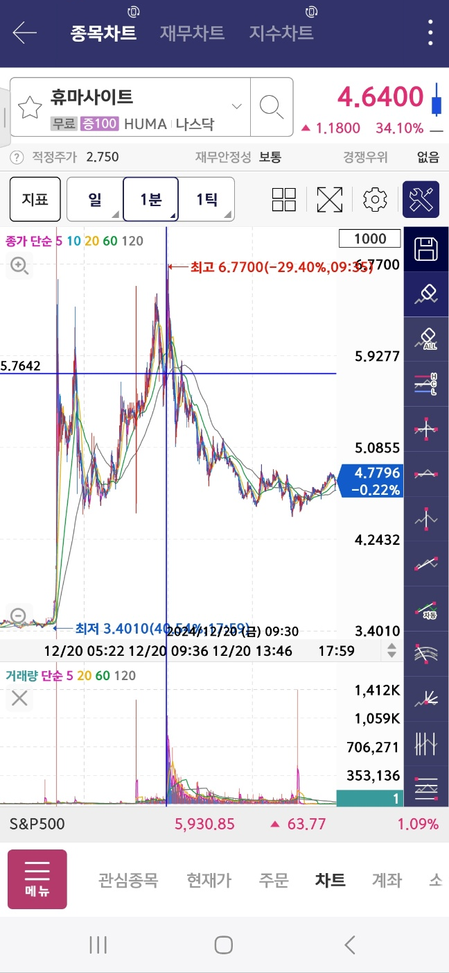 초반 차트이다. 마이사이즈는 초반 300프로대에서 시작했는데 장초에 상승한다. 리투스는 계속 하락. 헬리우스는 장 초반에 상승후 하락한다. 누비니는 짧게 상승 후 하락. 타오핑은 상승. 휴마사이트도 짧게 상승한다.