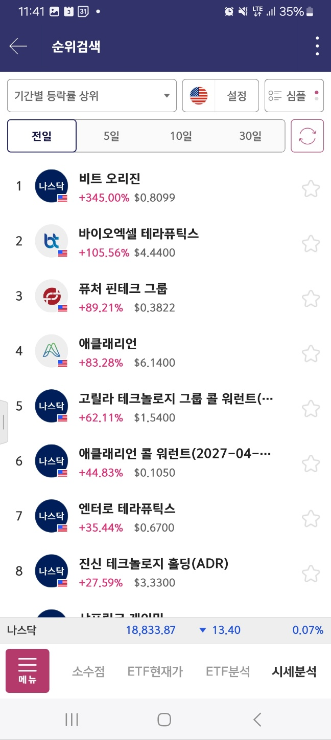 중반까지도 비트오리진이 가장 위에 있다. 단기적이지만 1달러 중반대까지 올라간다. 시간은 5시 25분경