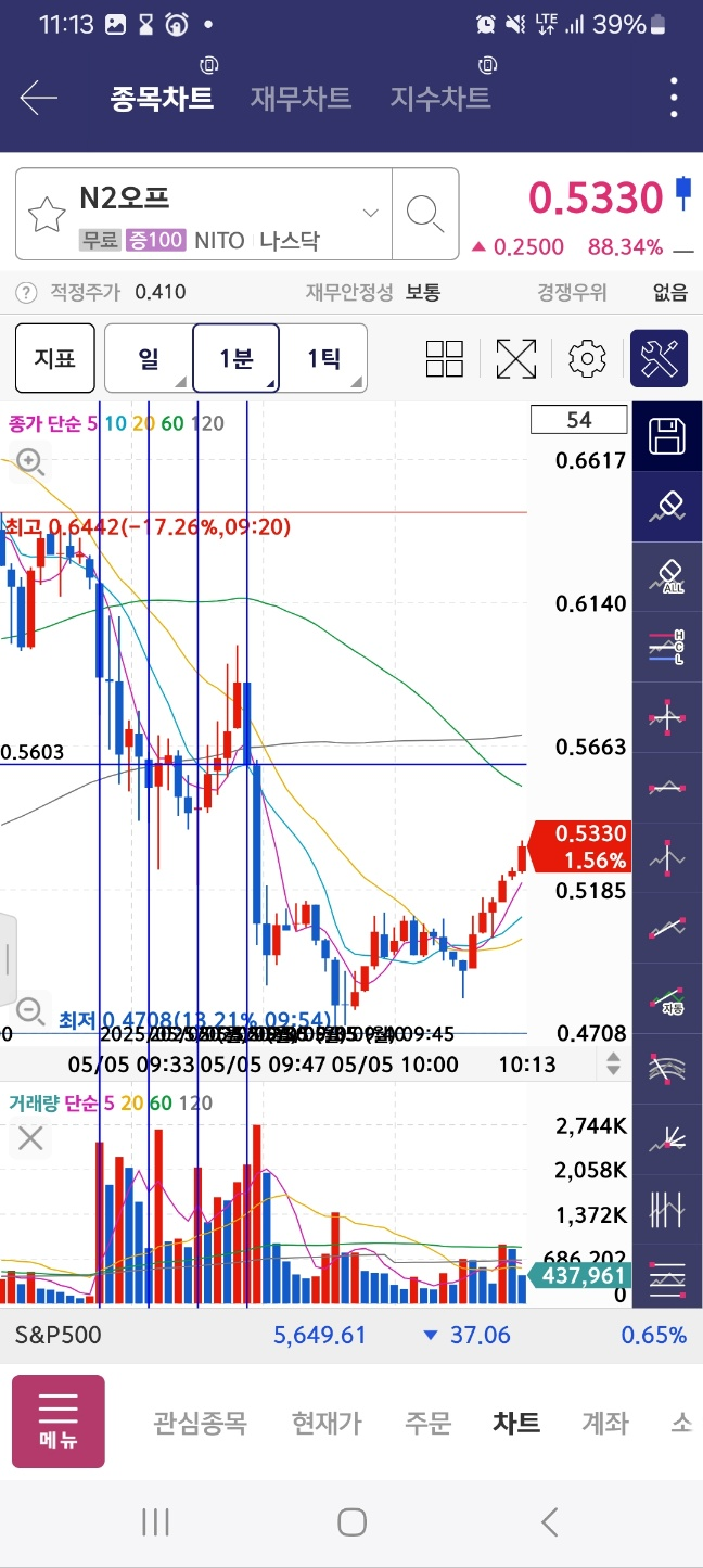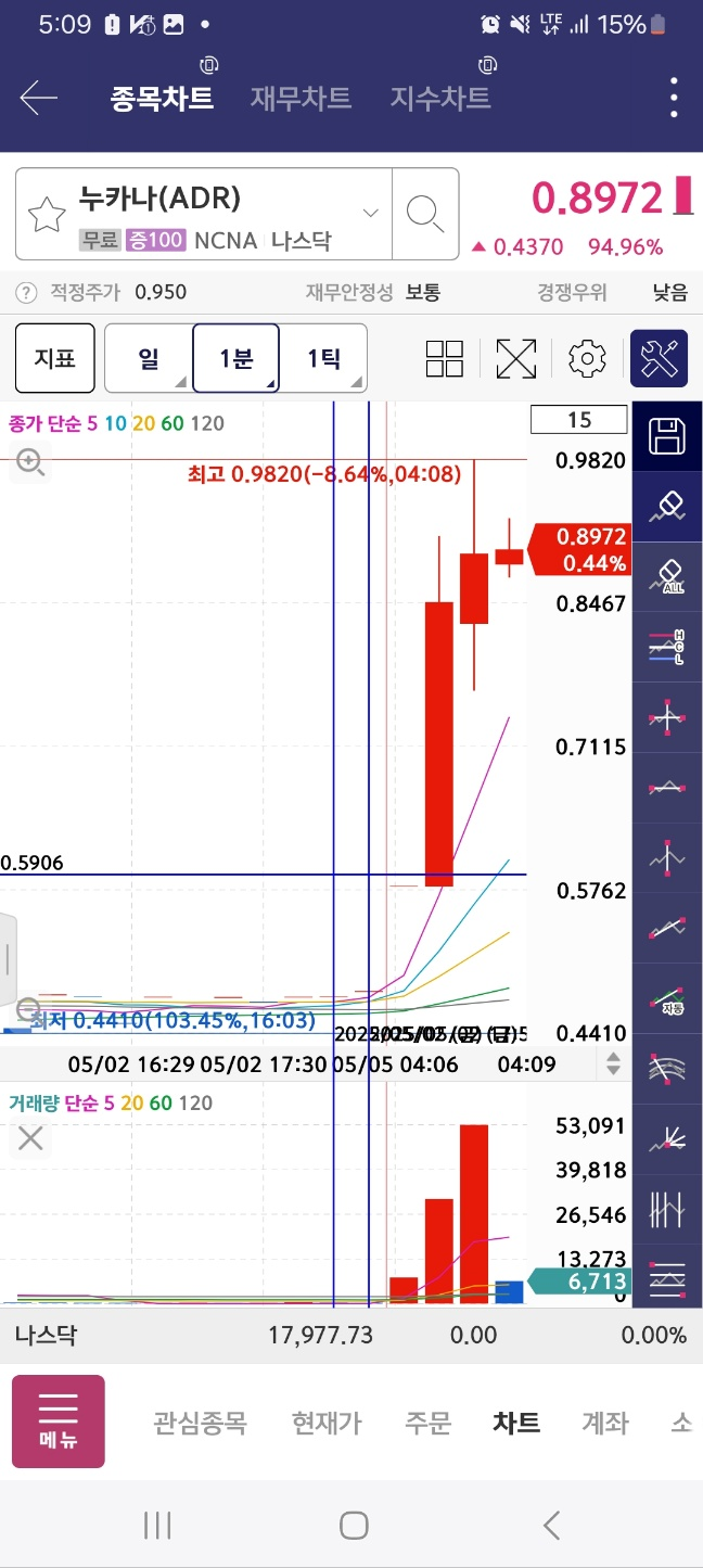 7분에 갑자기 올라오는 종목 누나카 상승세 / 거래량 증가 > 5분정도 상승한다.